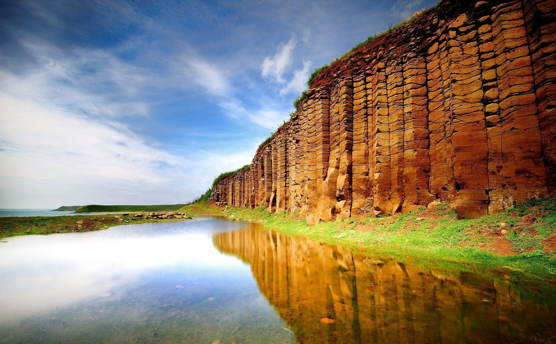 Helle Herbstlandschaft, dichter Wald hinter dem See, Steine