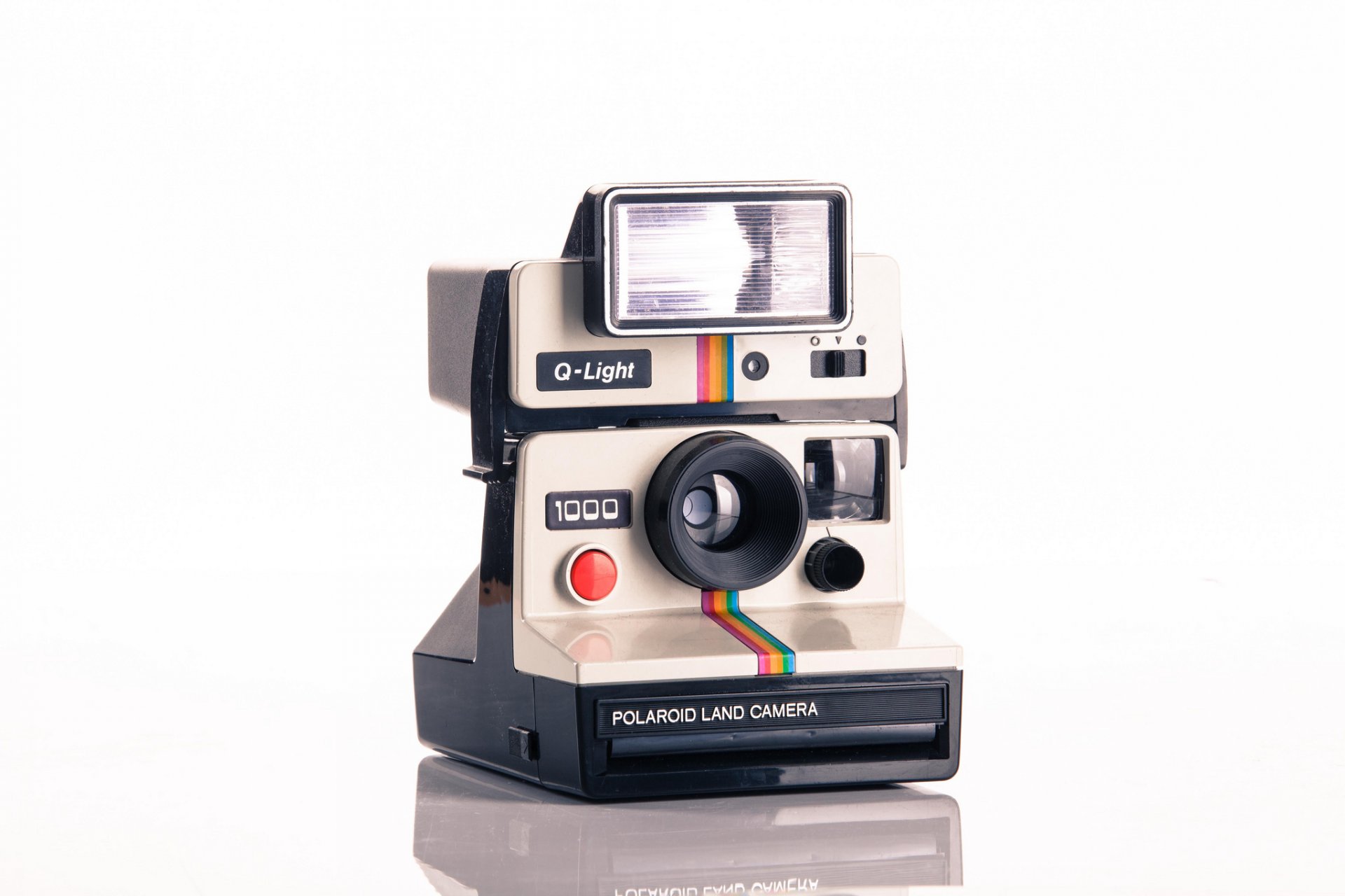 Automatische Polaroid-Kamera auf weißem Hintergrund