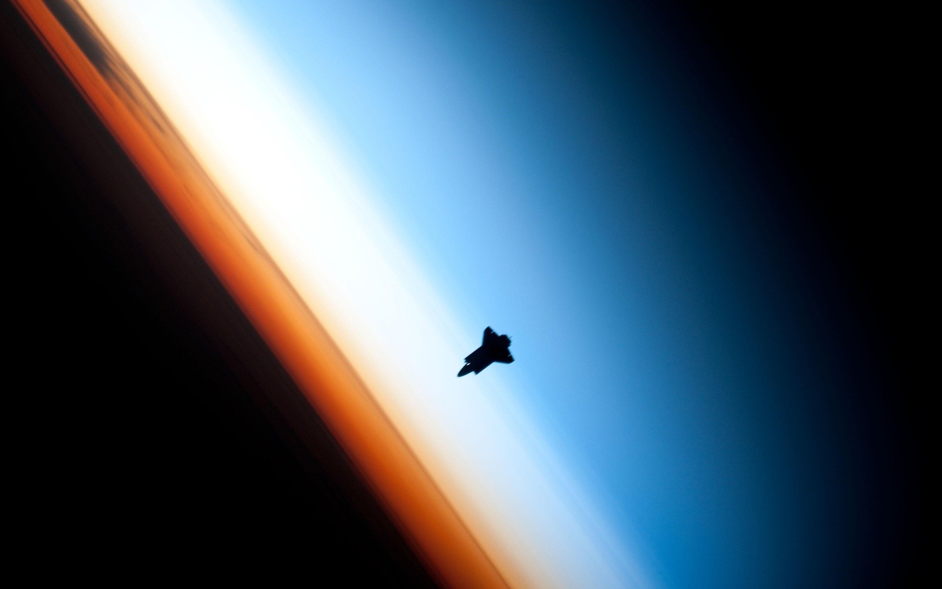 Space Shuttle vor dem Hintergrund von Wolken und Erde