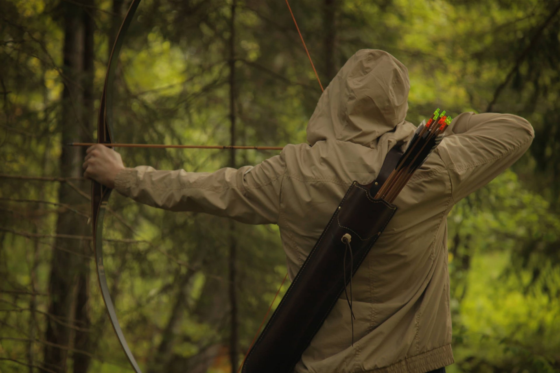 Lara croft hält einen bogen und geht durch den düsteren dschungelLara croft hält einen Bogen und geht durch den düsteren dschungel