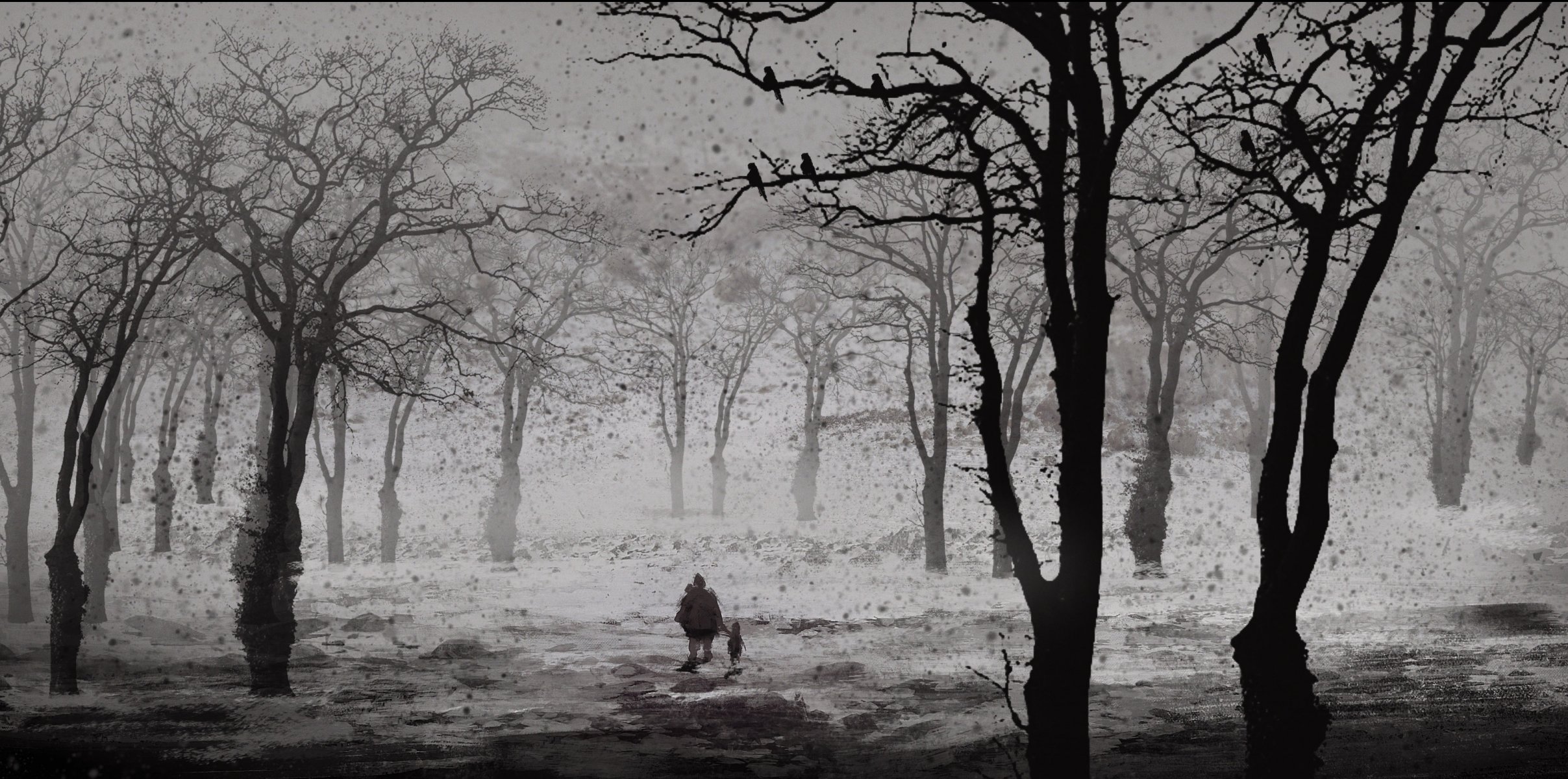 Ein Erwachsener und ein Kind in einem schwarz-weiß gemalten Wald