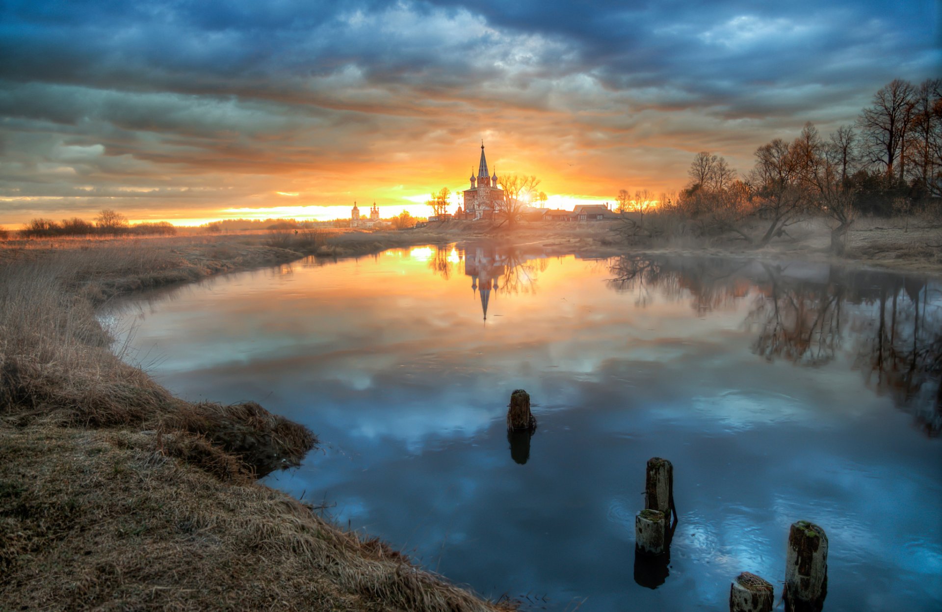 Kirche vor dem Teich vor dem Hintergrund der orangefarbenen Morgendämmerung