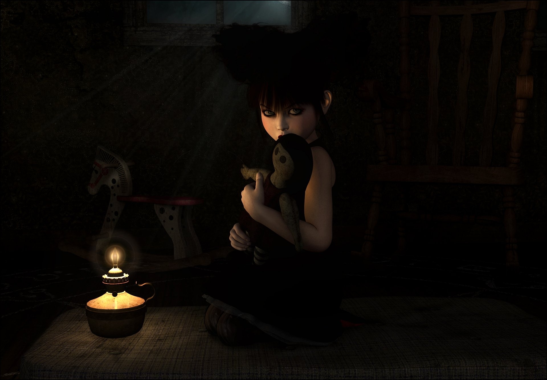 Ein Mädchen umarmt eine Puppe im Dunkeln an einer Kerze