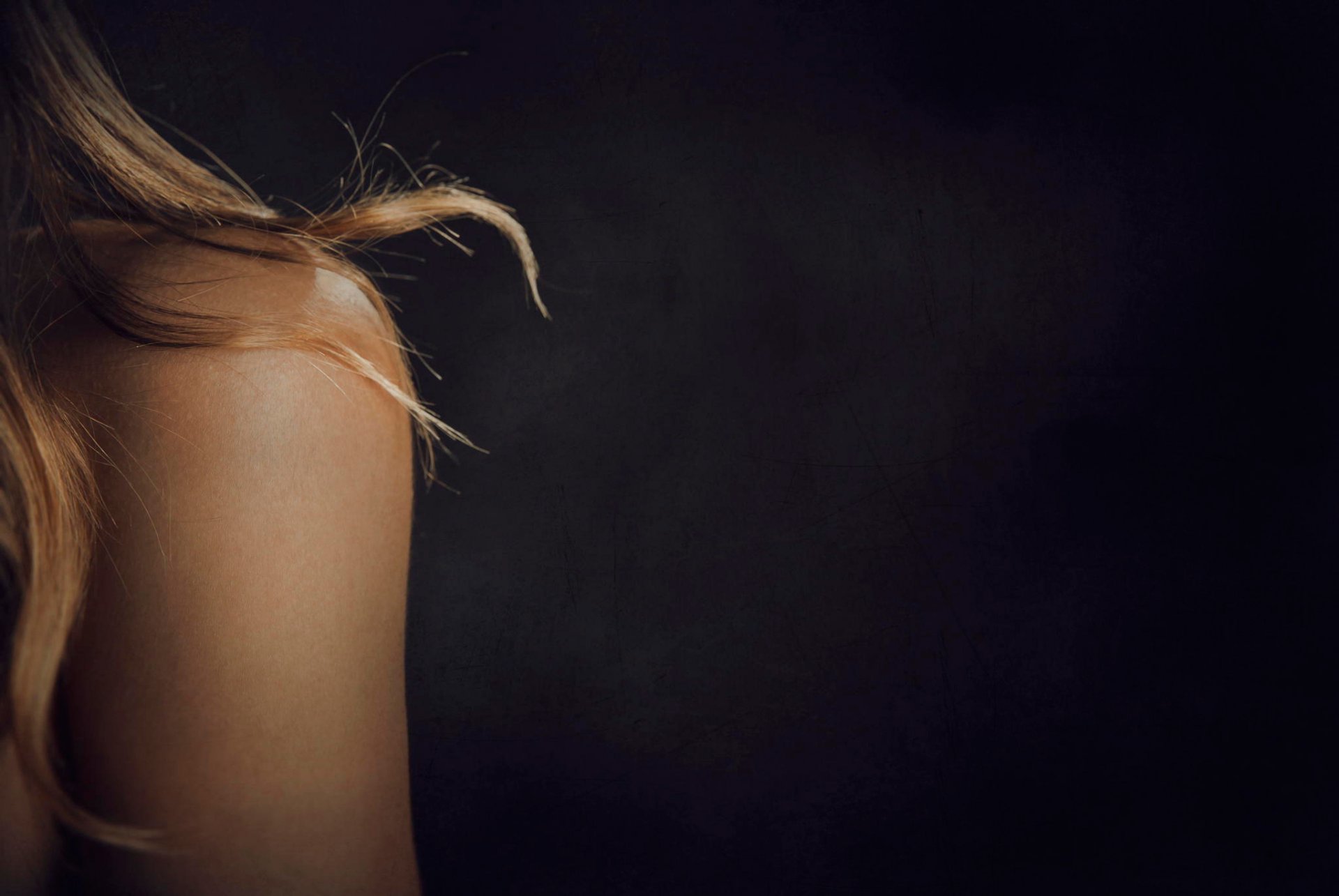 Blonde locken auf der schulter eines jungen mädchens. dunkler hintergrundBlonde Locken auf der Schulter eines jungen Mädchens. Dunkler Hintergrund