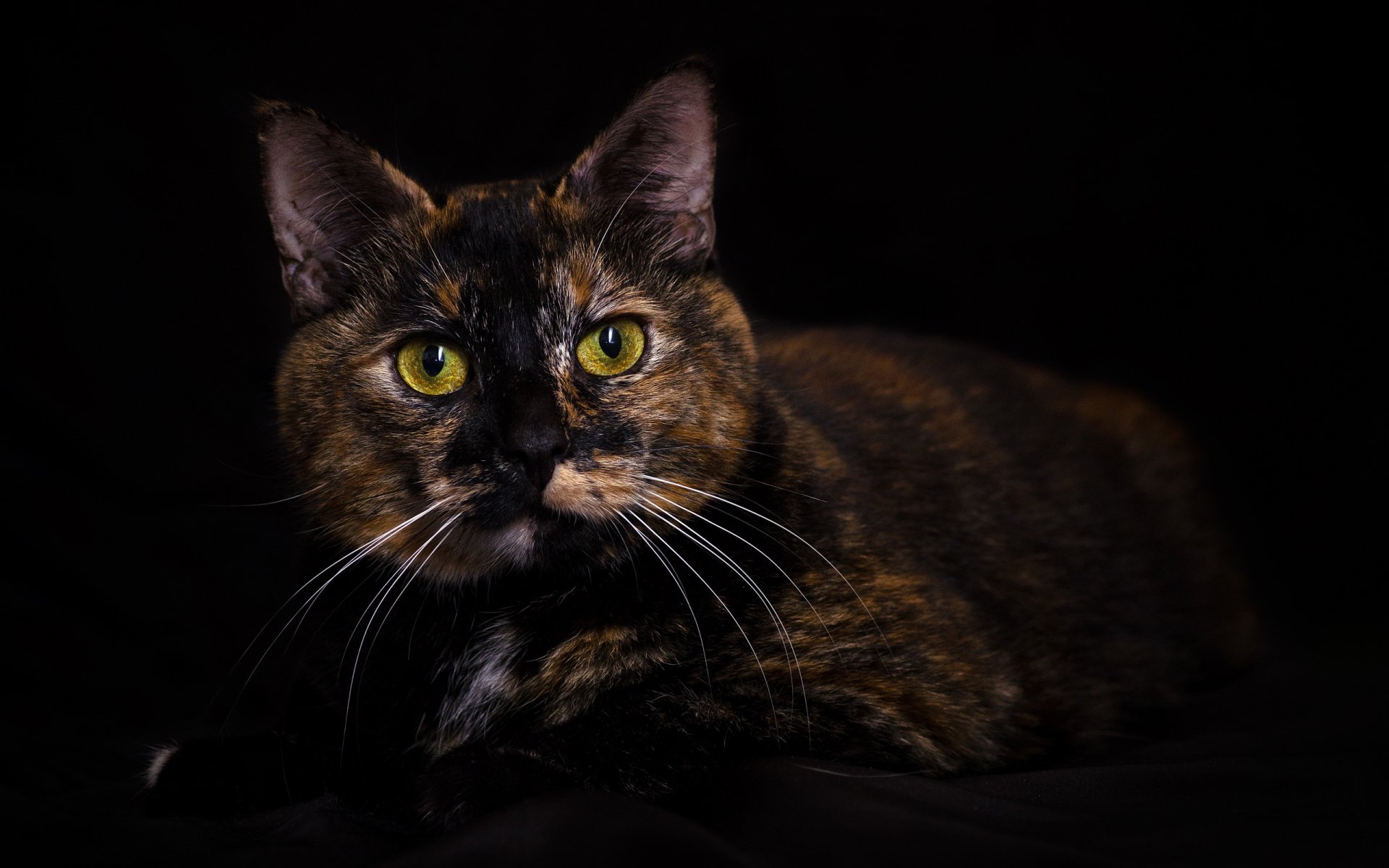 Porträt einer dreifarbigen Katze auf schwarzem Hintergrund