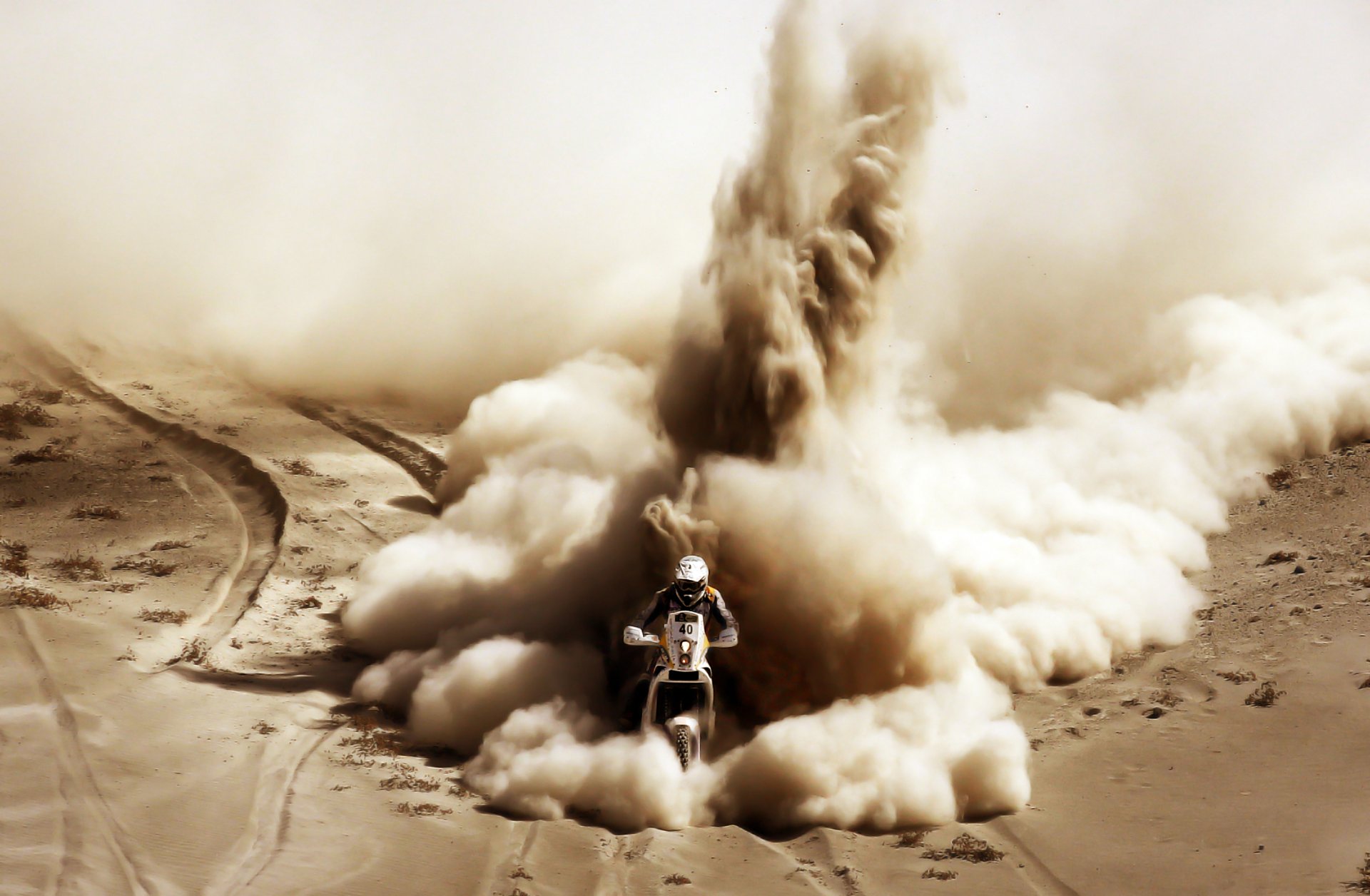 Ein Motorradfahrer fährt durch die Wüste und verteilt den Sand in verschiedene Richtungen durch eine riesige Rauchsäule