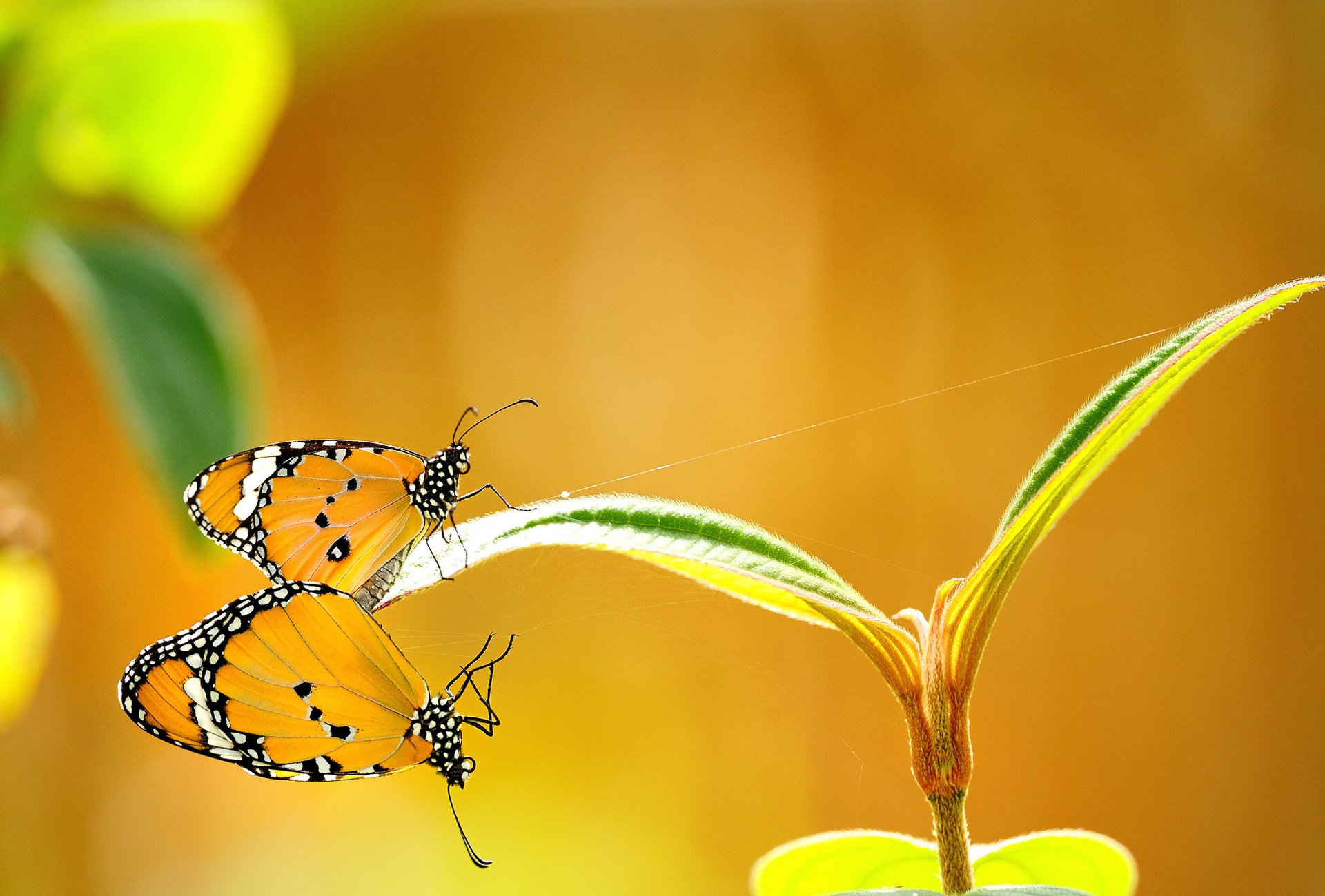 Zwei gelbe schmetterlinge sitzen auf einer pflanzeZwei gelbe Schmetterlinge sitzen auf einer Pflanze