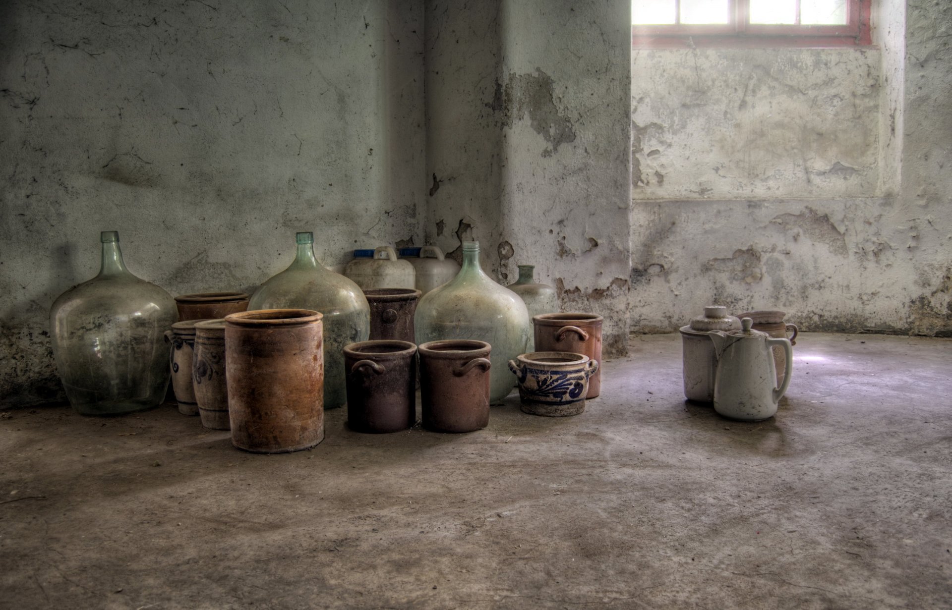 Zimmer mit großen Flaschen und Keramikgeschirr