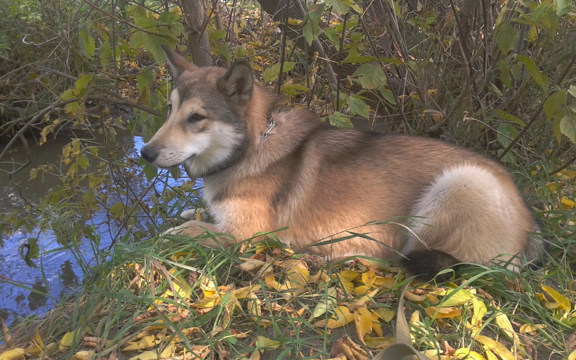 Im Wald liegt ein Hund auf Blättern