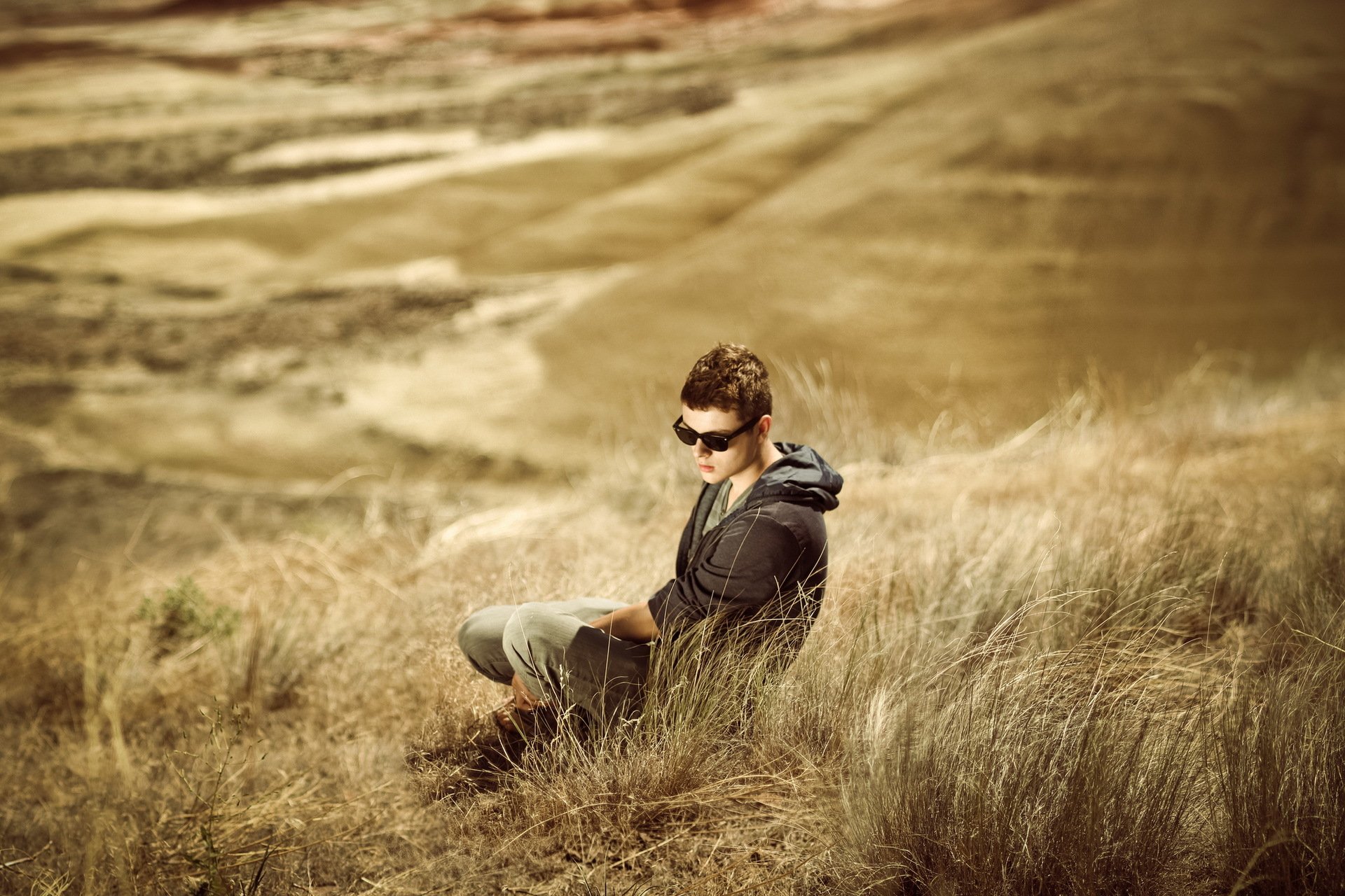 Ein Mann sitzt in einem Feld inmitten eines Grases