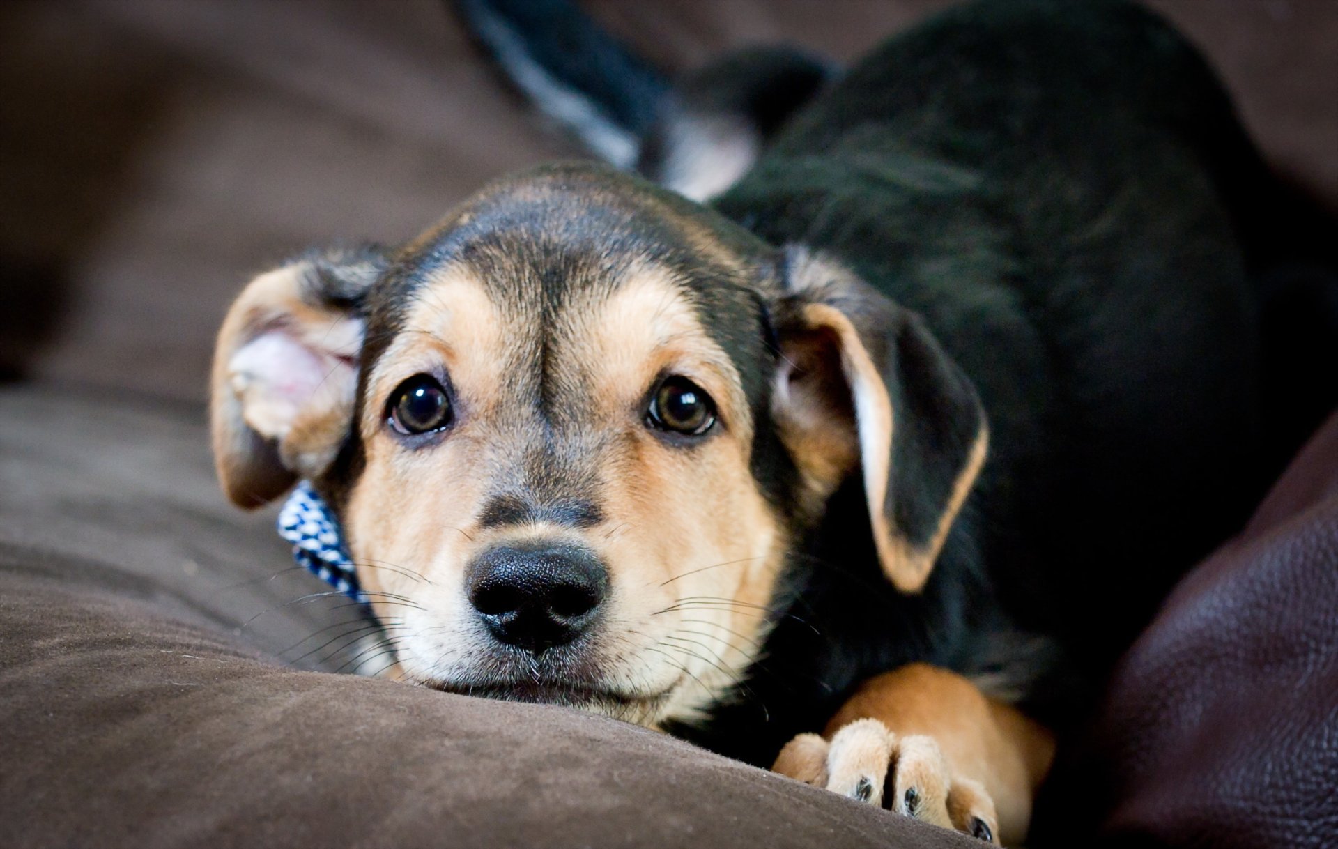 Ein schwarzer anzug-welpe schaut traurig irgendwo hinEin schwarzer Anzug-Welpe schaut traurig irgendwo hin