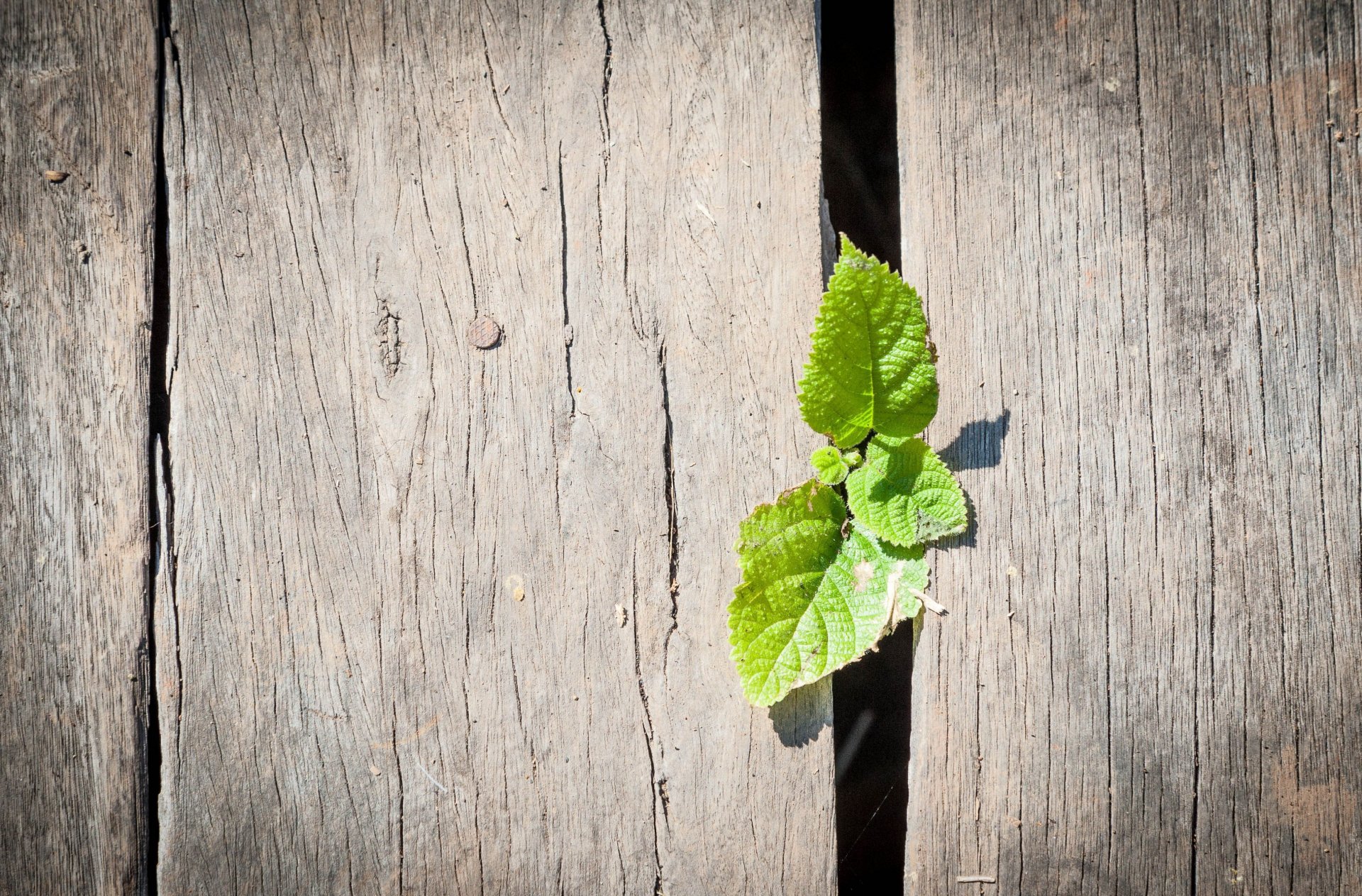 Ein zweig mit blättern schlägt sich durch holzbretterEin Zweig mit Blättern schlägt sich durch Holzbretter