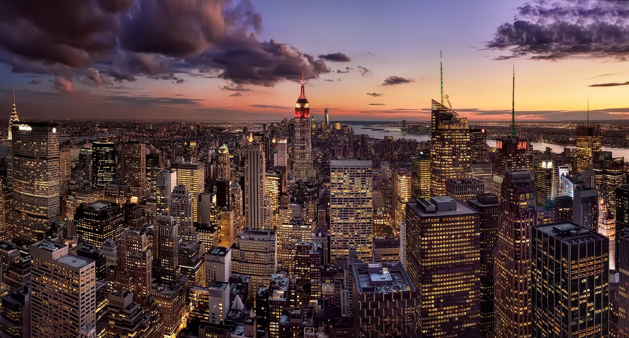 Eine riesige, glitzernde Metropole unter dem Abendhimmel