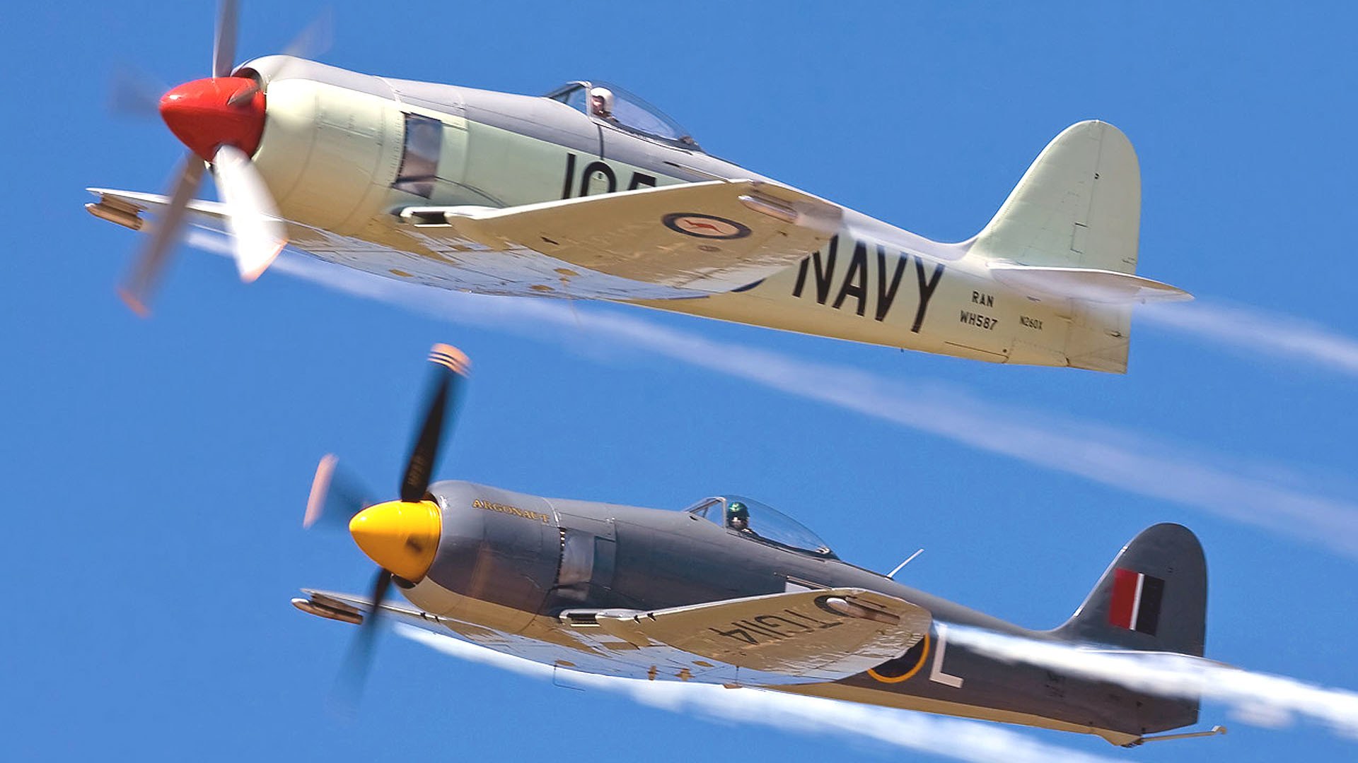 Parade von kampfflugzeugen mit propellern am himmelParade von Kampfflugzeugen mit Propellern am Himmel