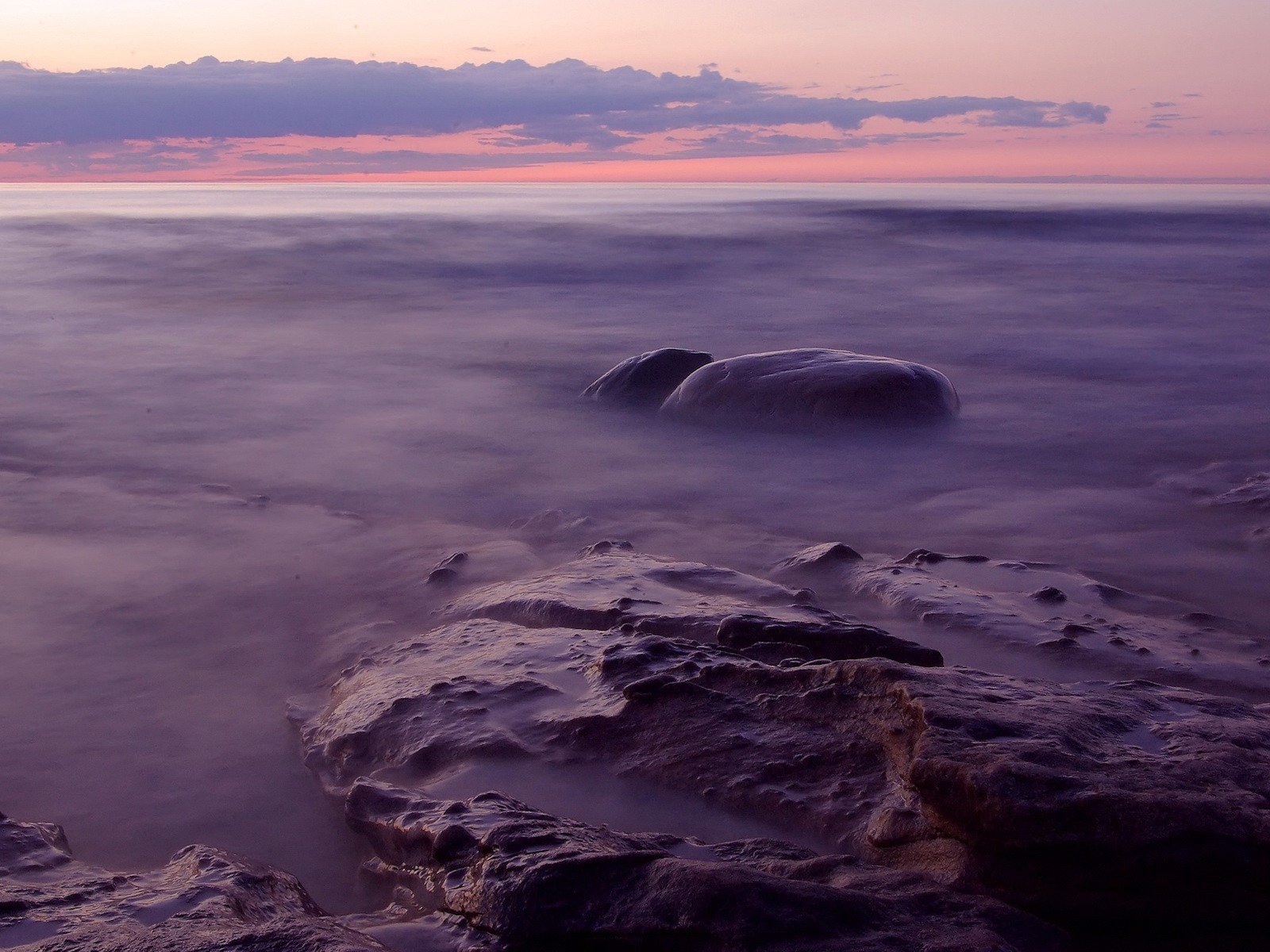 Strand und felsen, die bei sonnenuntergang im meer ertrinken