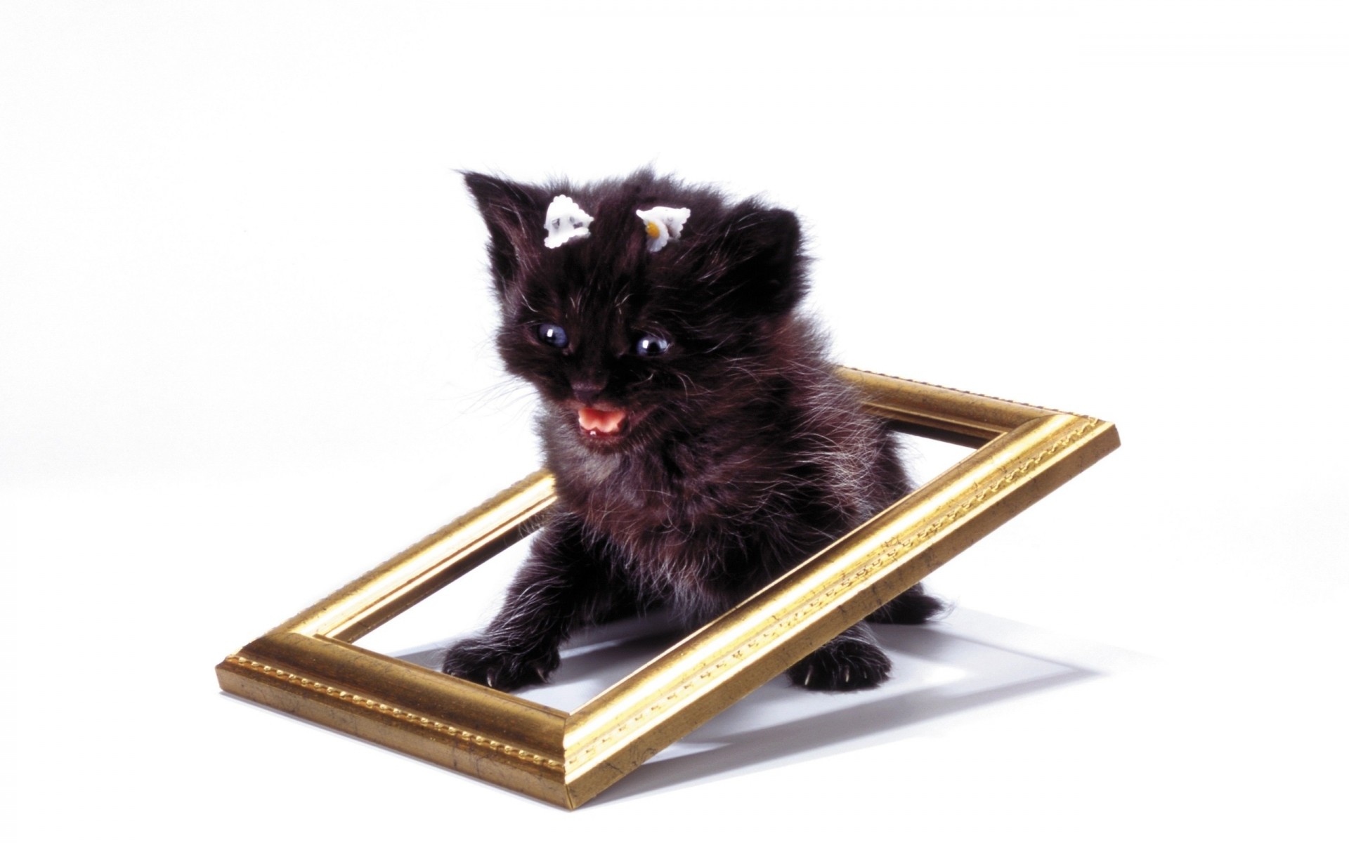 Das kätzchen schreit verängstigt, während es im rahmen sitztDas Kätzchen schreit verängstigt, während es im Rahmen sitzt