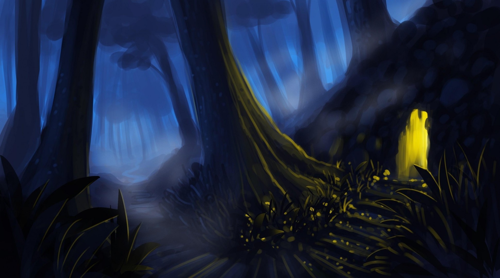 Im Wald gibt es einen Eingang im Baum und dort ist Licht