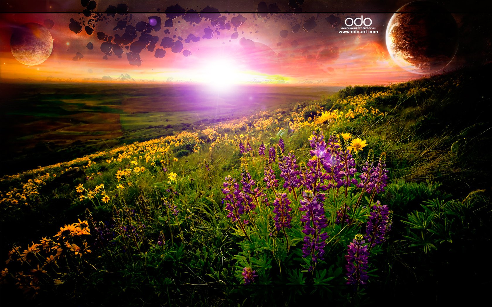 Fantastischer Sonnenuntergang vor dem Hintergrund eines blühenden Feldes