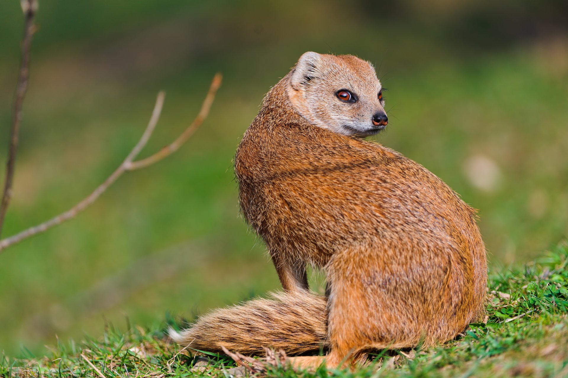 Der Blick eines Mungo, der auf dem grünen Gras sitzt