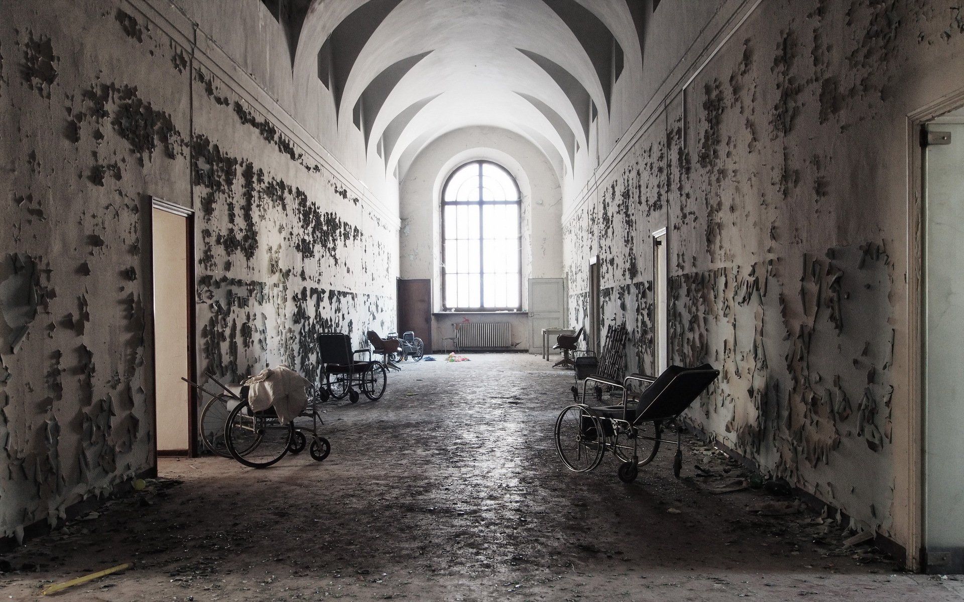 Ein düsterer raum mit einem fenster und einem stuhlEin düsterer Raum mit einem Fenster und einem Stuhl