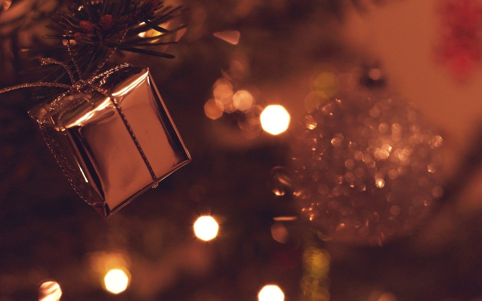 Weihnachtskugeln und geschenk vor dem hintergrund der lichterWeihnachtskugeln und Geschenk vor dem Hintergrund der Lichter