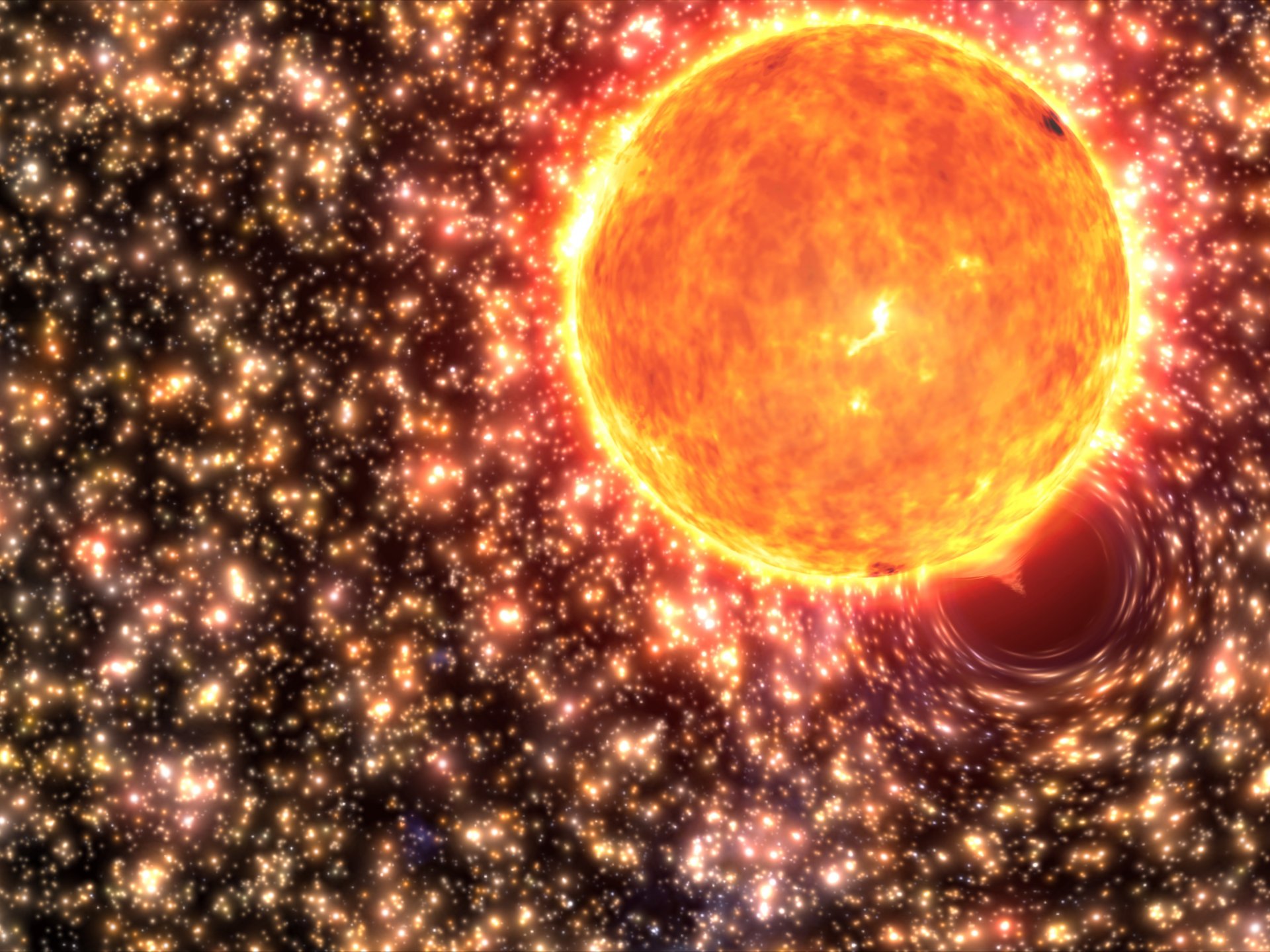 Ein feuerball, der durch ein schwarzes loch in einem ballhaufen absorbiert wirdEin Feuerball, der durch ein Schwarzes Loch in einem Ballhaufen absorbiert wird