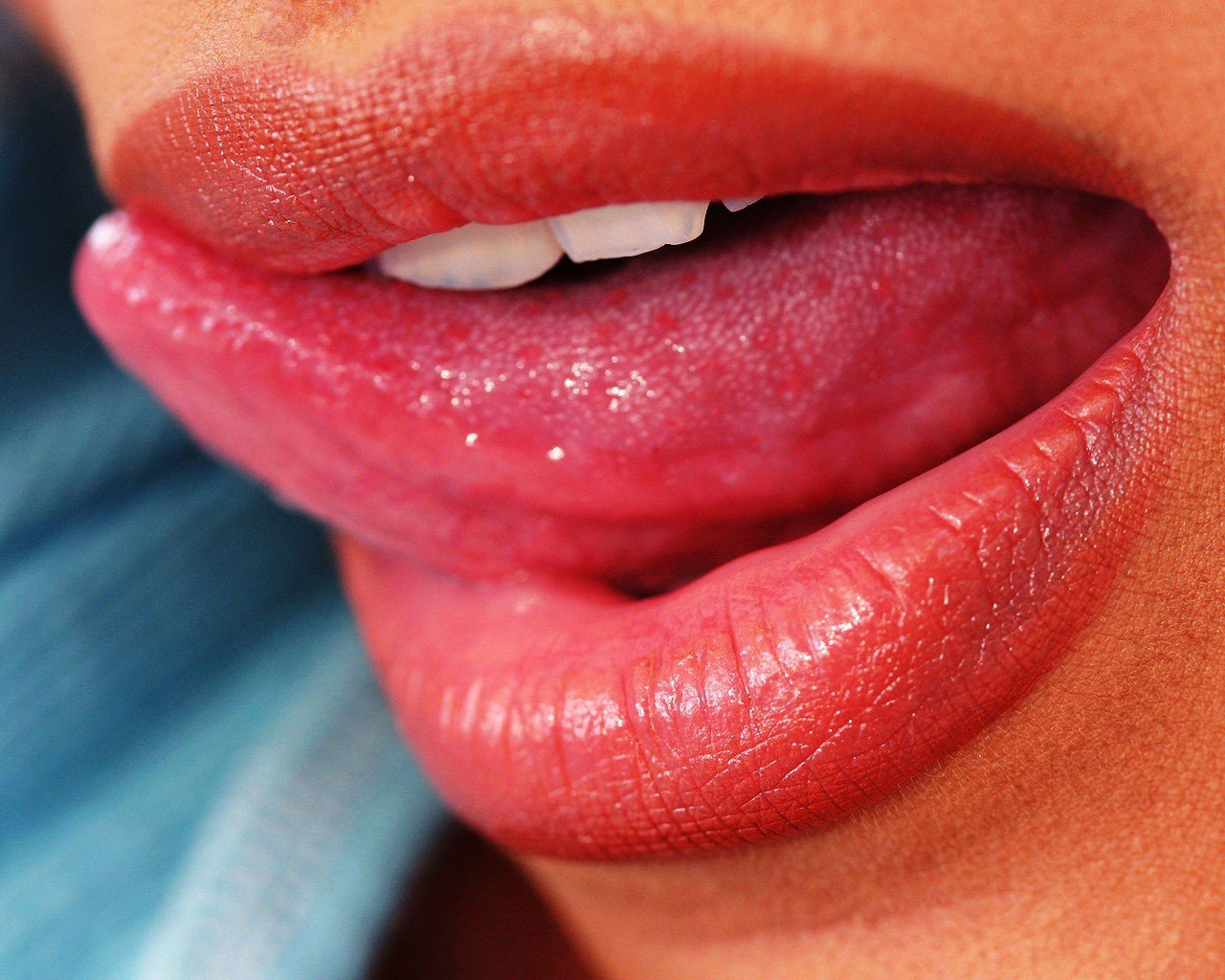 Porträt eines dunkelhaarigen Mädchens mit einer Klinge im Mund
