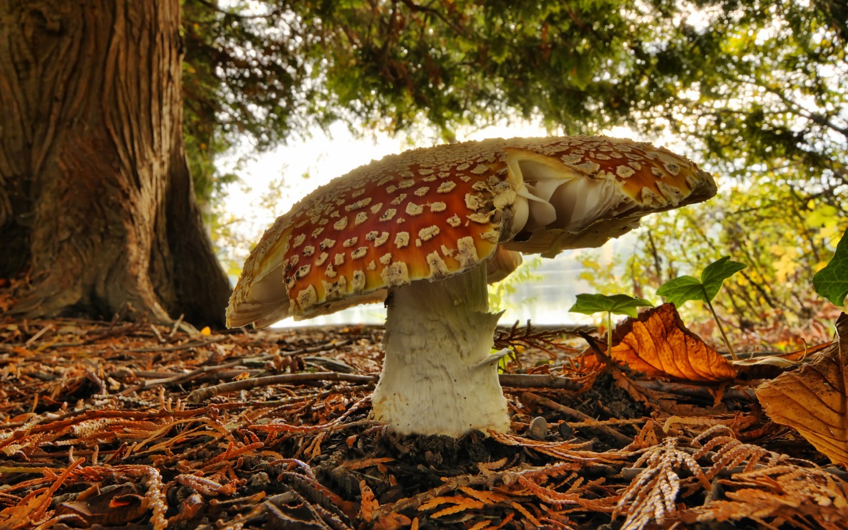 Herbst. Fliegenpilz unter Laub und dahinter ein Baum