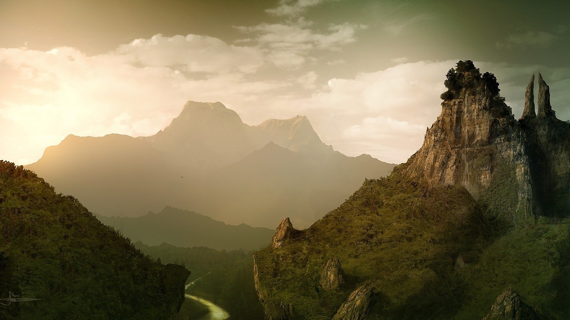 Geheimnisvolle Berge mit einem Fluss, der in der Nähe fließt