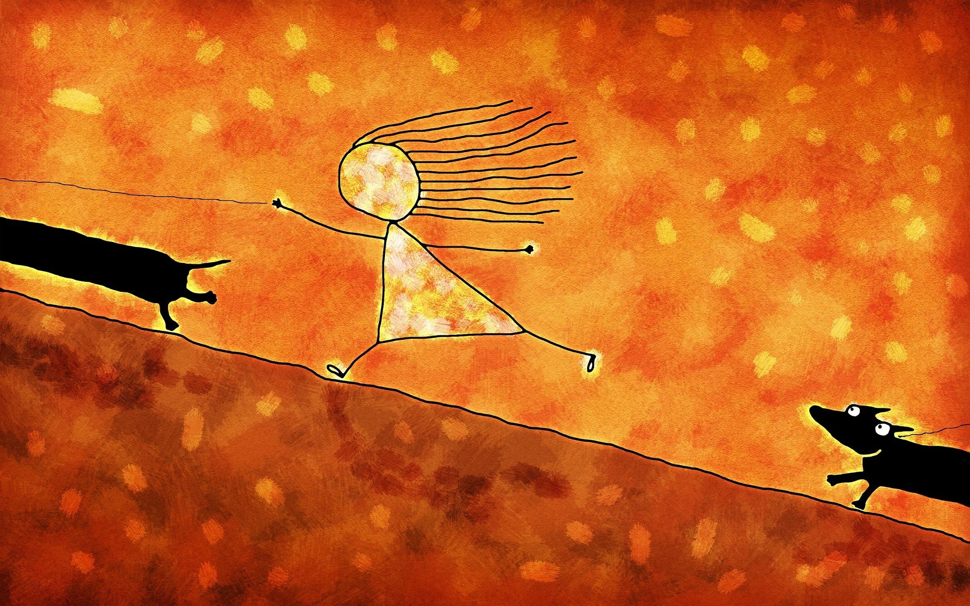 Ein Muster in orangefarbener Farbe, in dem ein Mädchen einem Hund an der Leine folgt