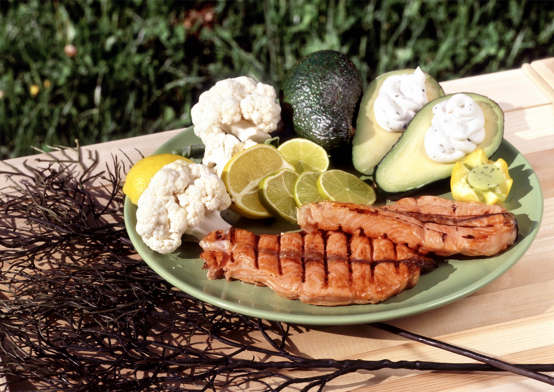 Kotelett mit Zitrone, Brokkoli und Kräutern auf einem Teller