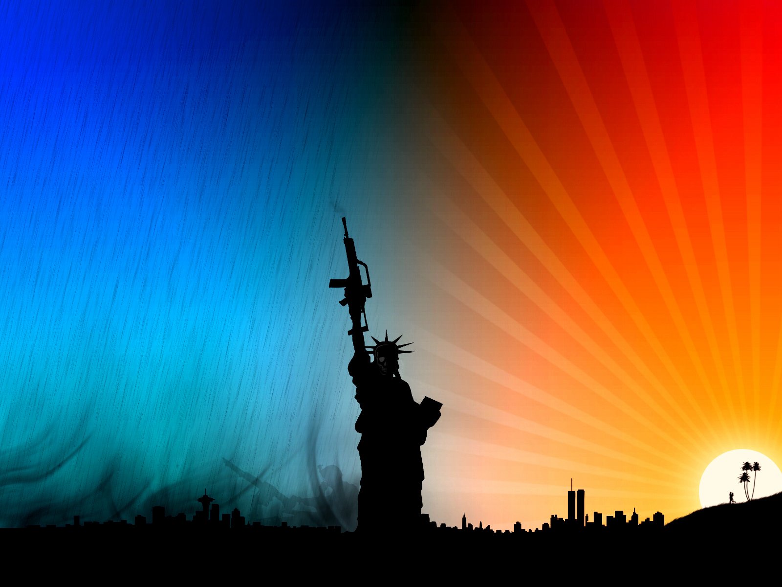 Freiheitsstatue mit maschinengewehr in der hand vor dem hintergrund der untergehenden sonneFreiheitsstatue mit Maschinengewehr in der Hand vor dem Hintergrund der untergehenden Sonne