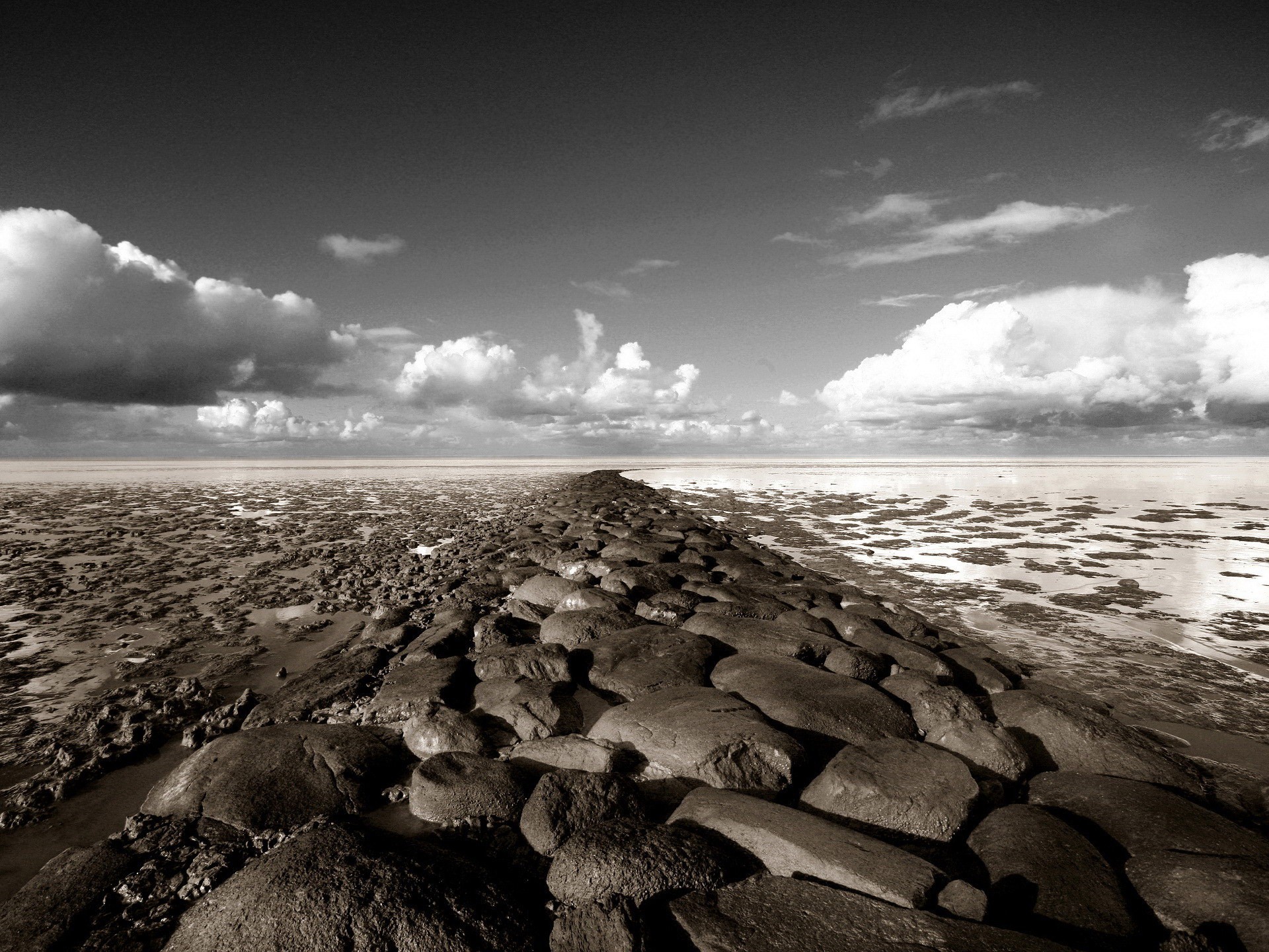 Es gibt nur viele steine am horizont und graue wolken über ihnenEs gibt nur viele Steine am Horizont und graue Wolken über ihnen