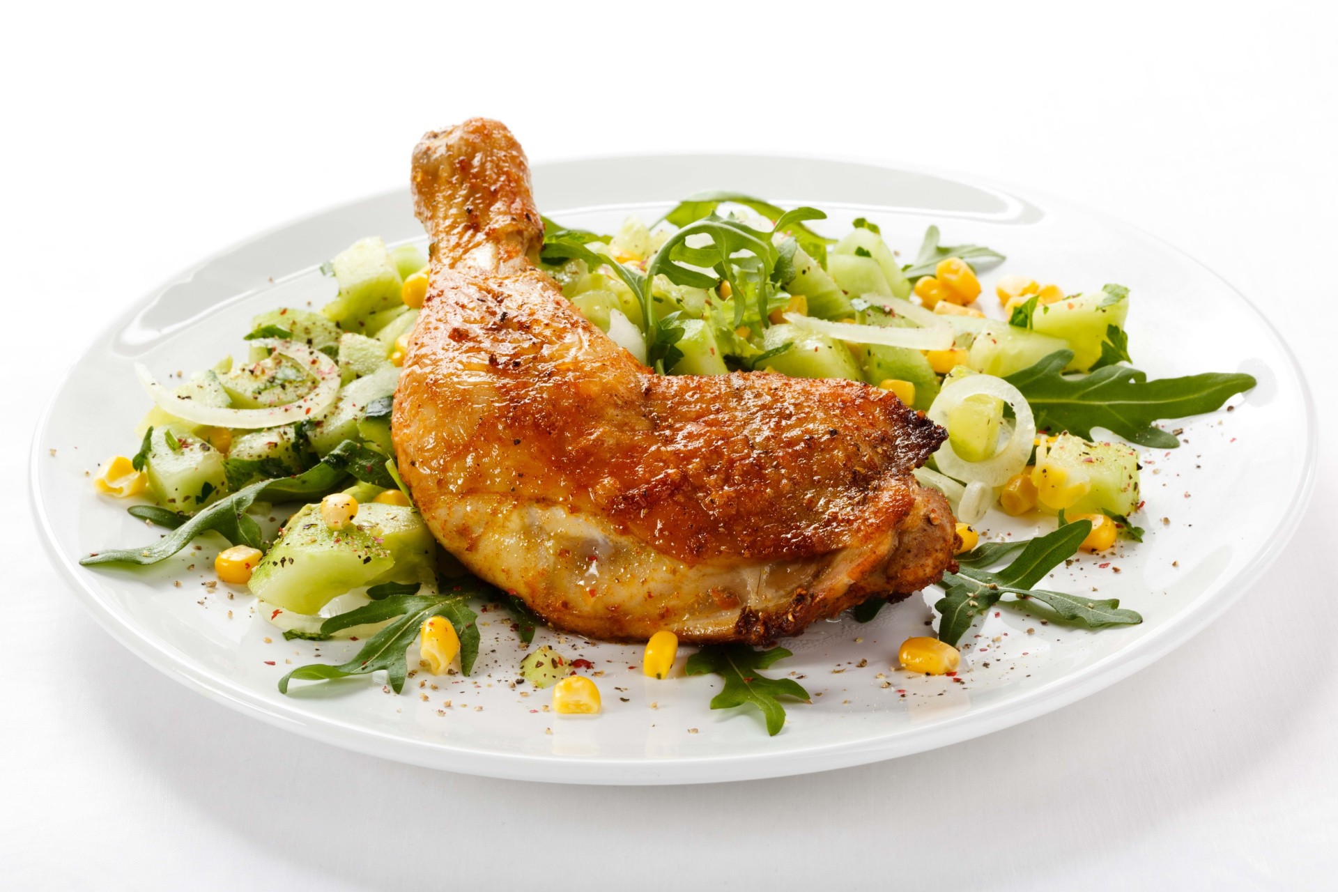 Schild auf weißem hintergrund mit einem stück huhnSchild auf weißem Hintergrund mit einem Stück Huhn