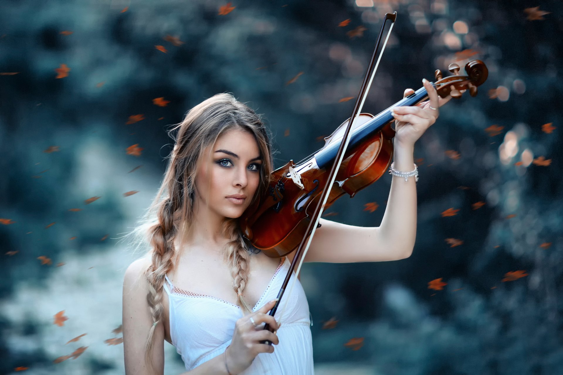 Ein Mädchen in Rot mit einer Geige. Herbstzeit