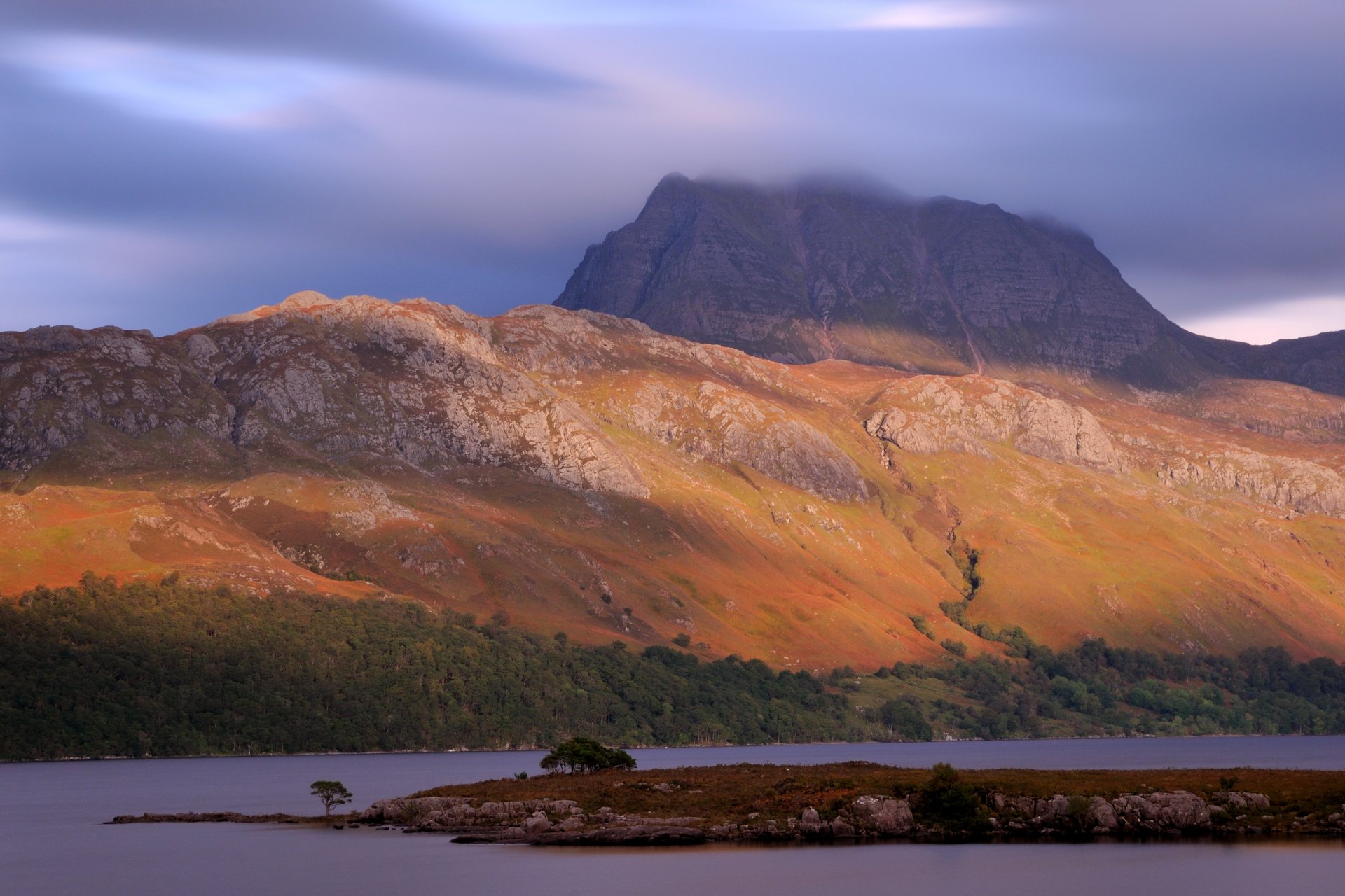 Sonnenuntergang über einem see und bergen in großbritannienSonnenuntergang über einem See und Bergen in Großbritannien