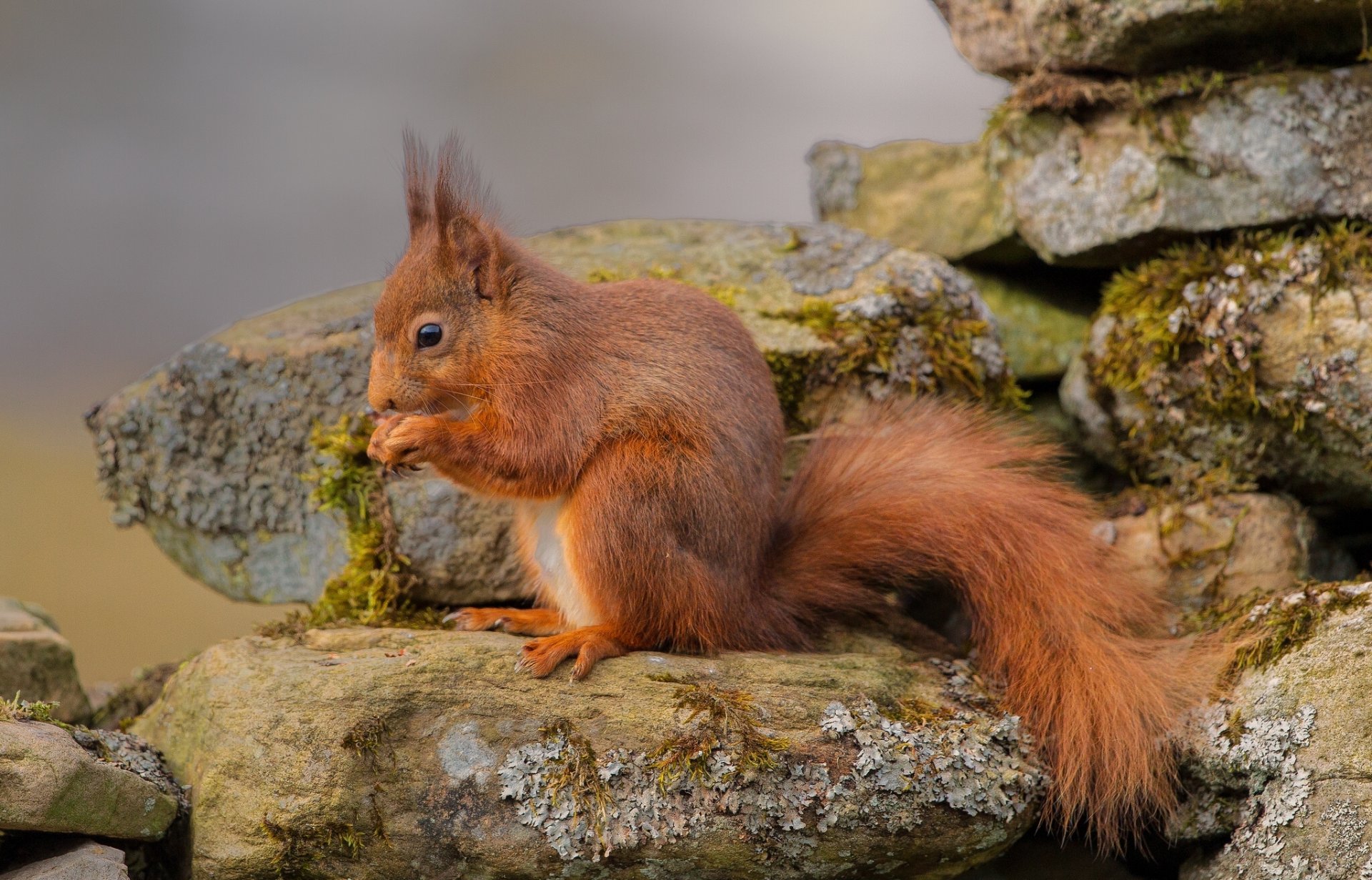 Eichhörnchen sitzt in Stein und isst