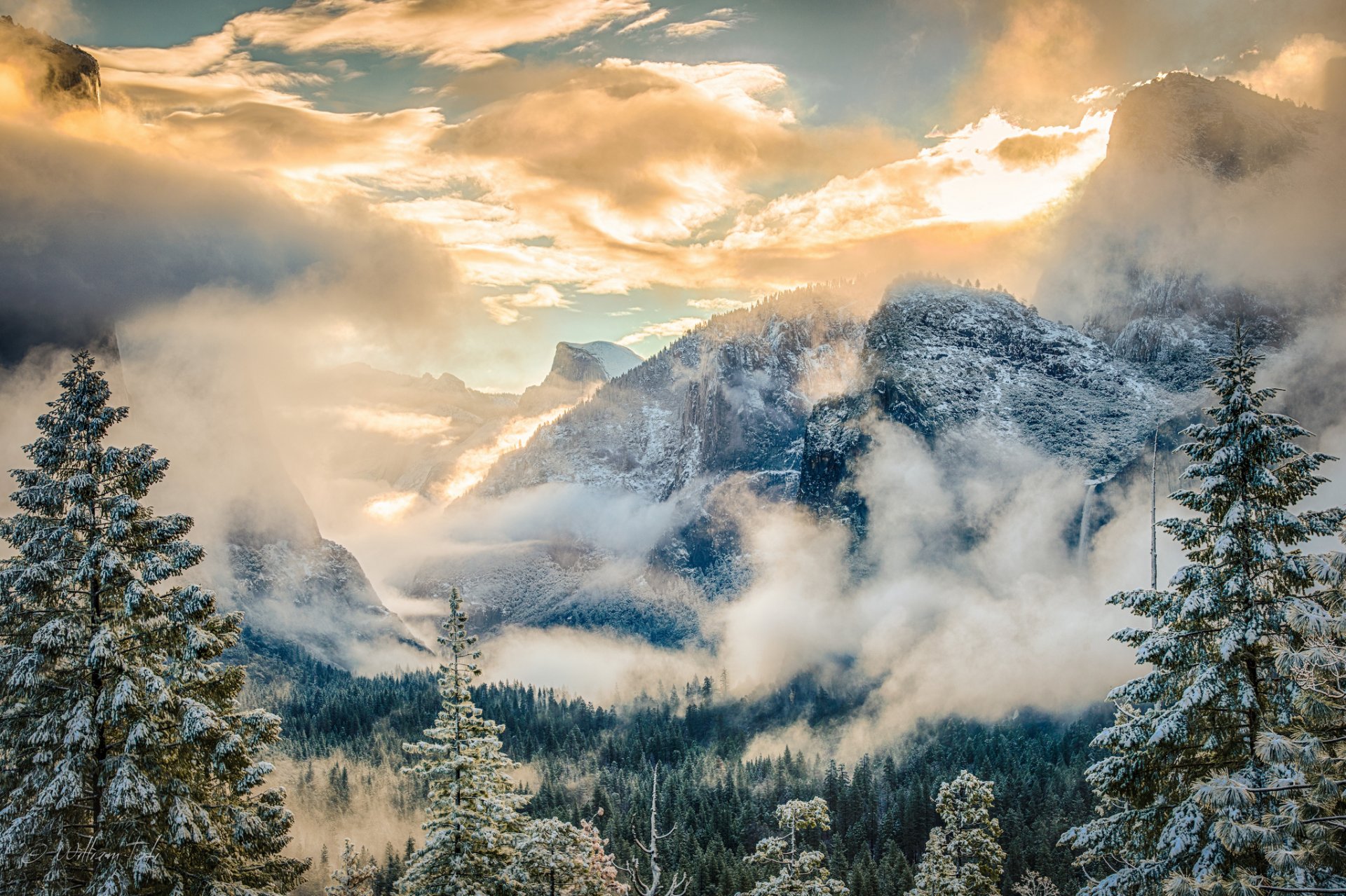 Der yosemite national park in kalifornien, usa, bietet berge, einen schönen wald , eine vielzahl von bäumen , einen gebirgsfluss