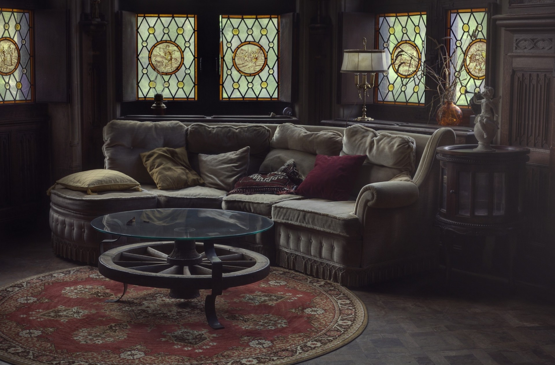Glasmalerei, die in form von blättern auf glas abgebildet istGlasmalerei, die in Form von Blättern auf Glas abgebildet ist