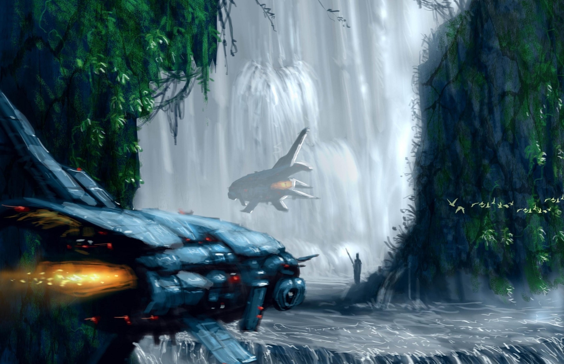 Felsiges ufer unter einem wasserfall in der dämmerungFelsiges Ufer unter einem Wasserfall in der Dämmerung