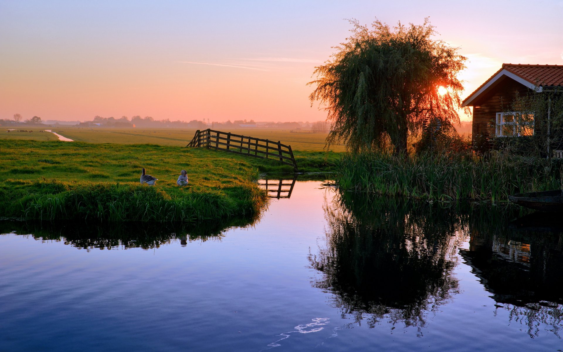 Fantastische landschaft. teich auf dem hintergrund des planeten am himmelFantastische Landschaft. Teich auf dem Hintergrund des Planeten am Himmel