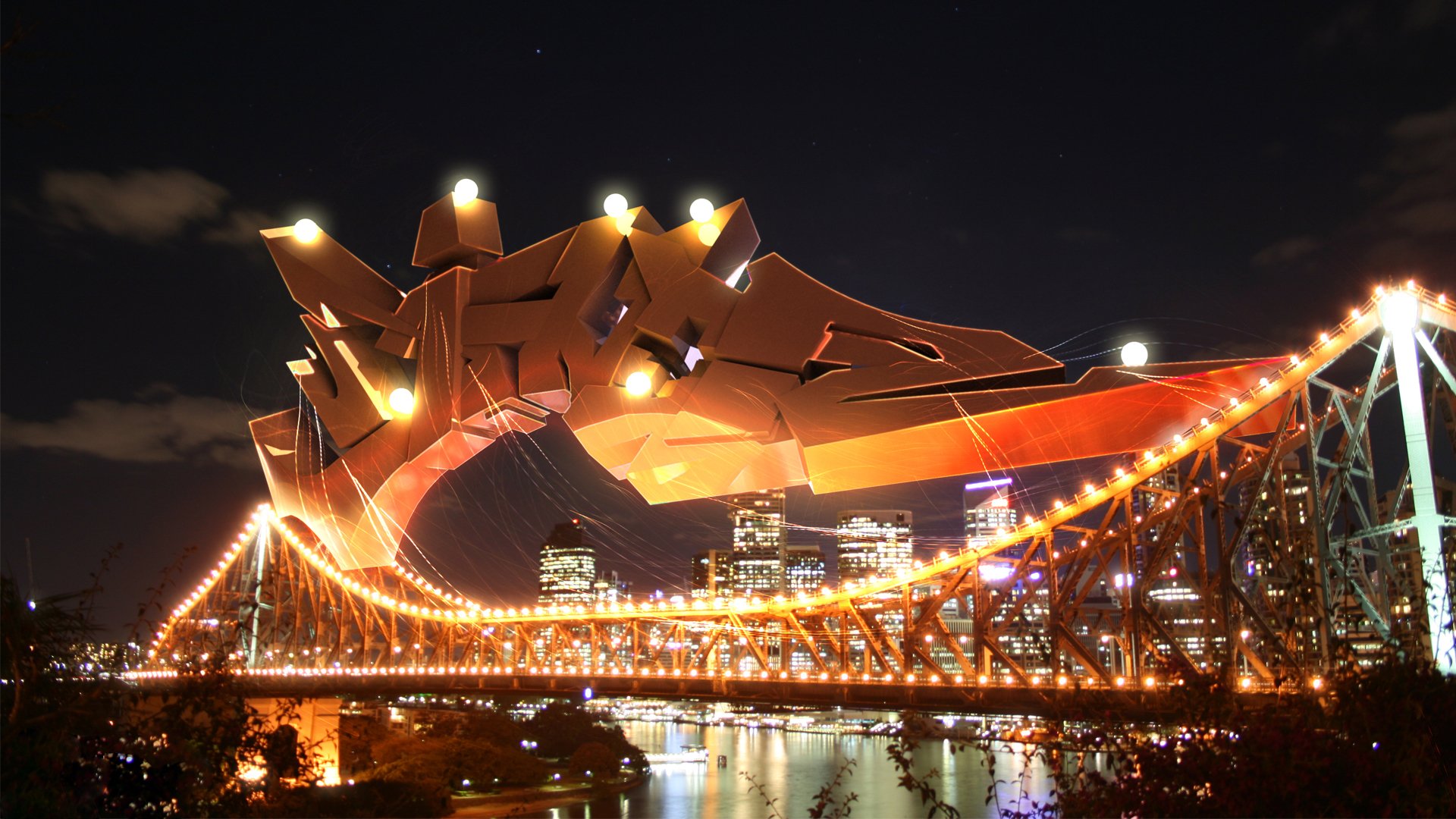 Brücke aus voluminösem Metallgraffiti in Abendlichtern