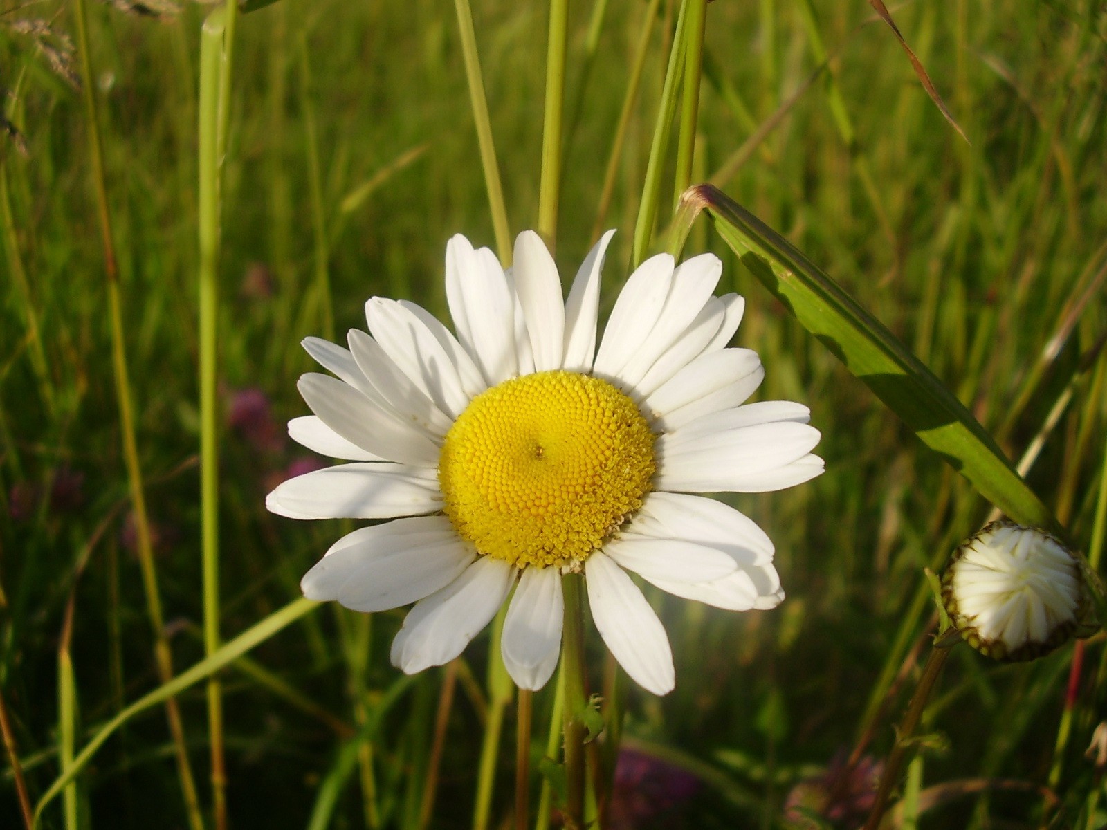 Große Kamille, die von der Sonne im grünen Gras beleuchtet wird