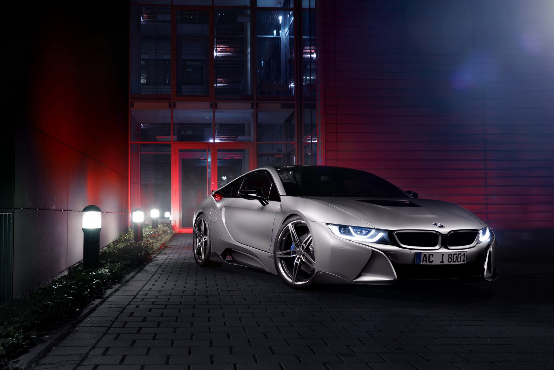 Bmw i8 in grau vor dem hintergrund eines gebäudes mit roter hintergrundbeleuchtungBMW i8 in Grau vor dem Hintergrund eines Gebäudes mit roter Hintergrundbeleuchtung
