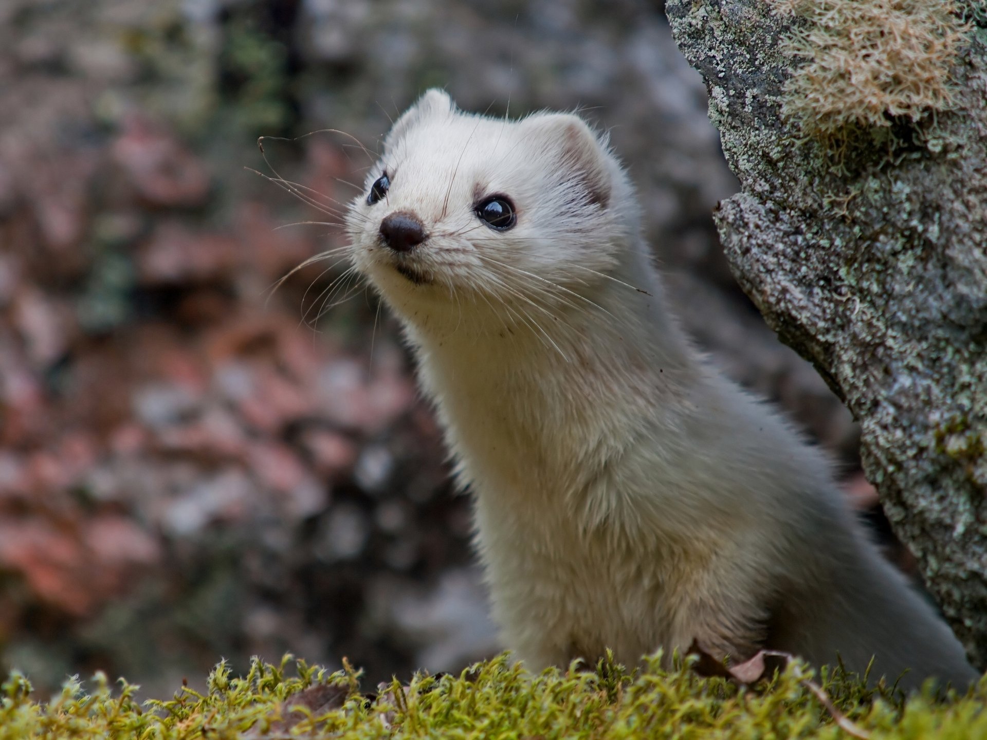 Ein hermelin, der hinter einem grauen stein schautEin Hermelin, der hinter einem grauen Stein schaut