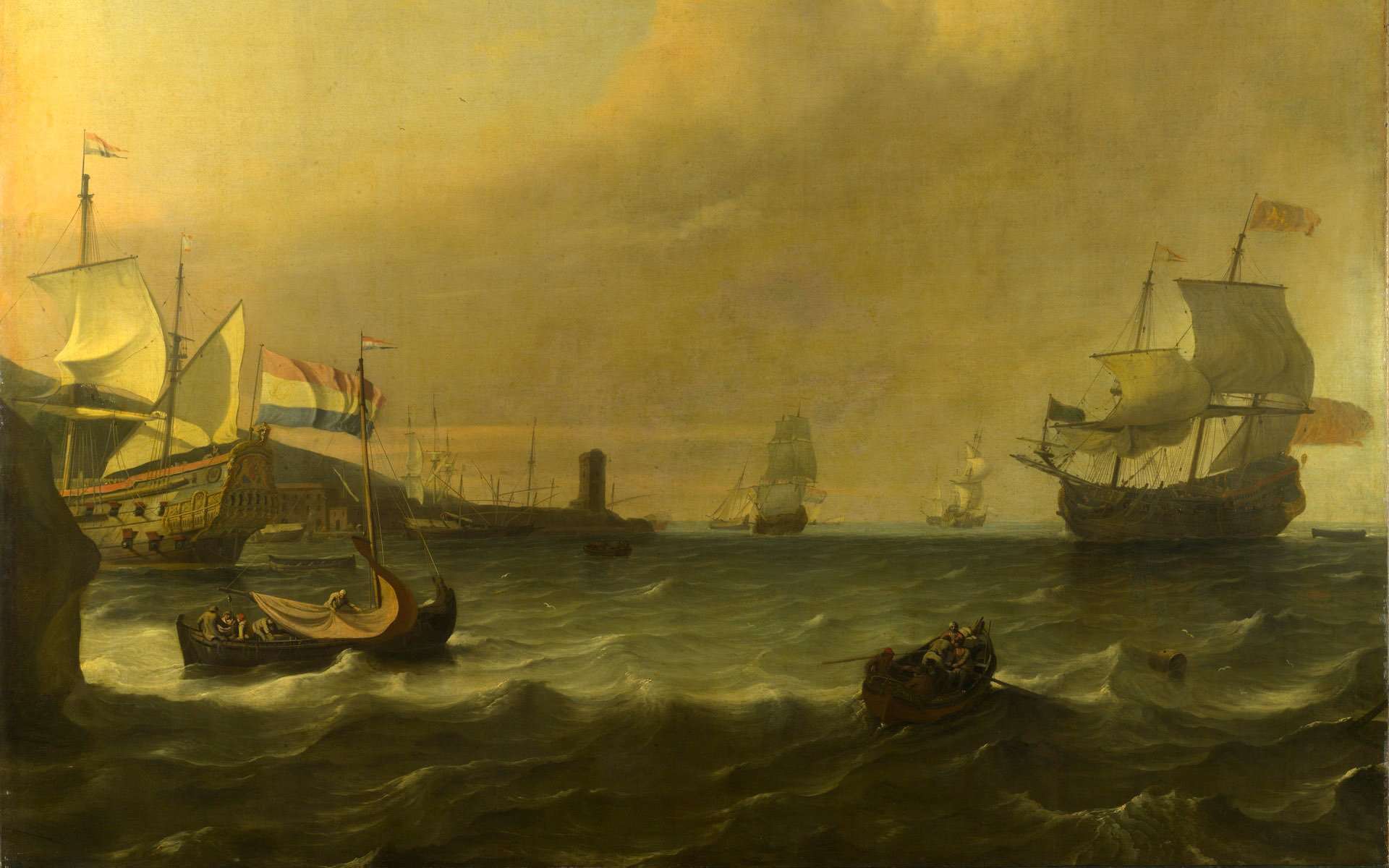 Schiffe fahren bei Sonnenuntergang in den Hafen ein