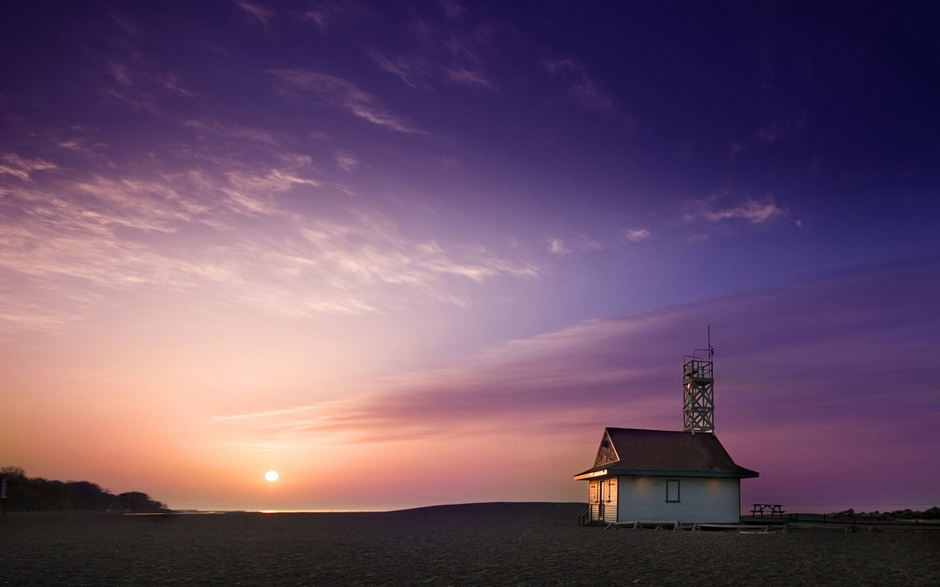 Haus am Meer, vor dem Hintergrund von Himmel und Sonne
