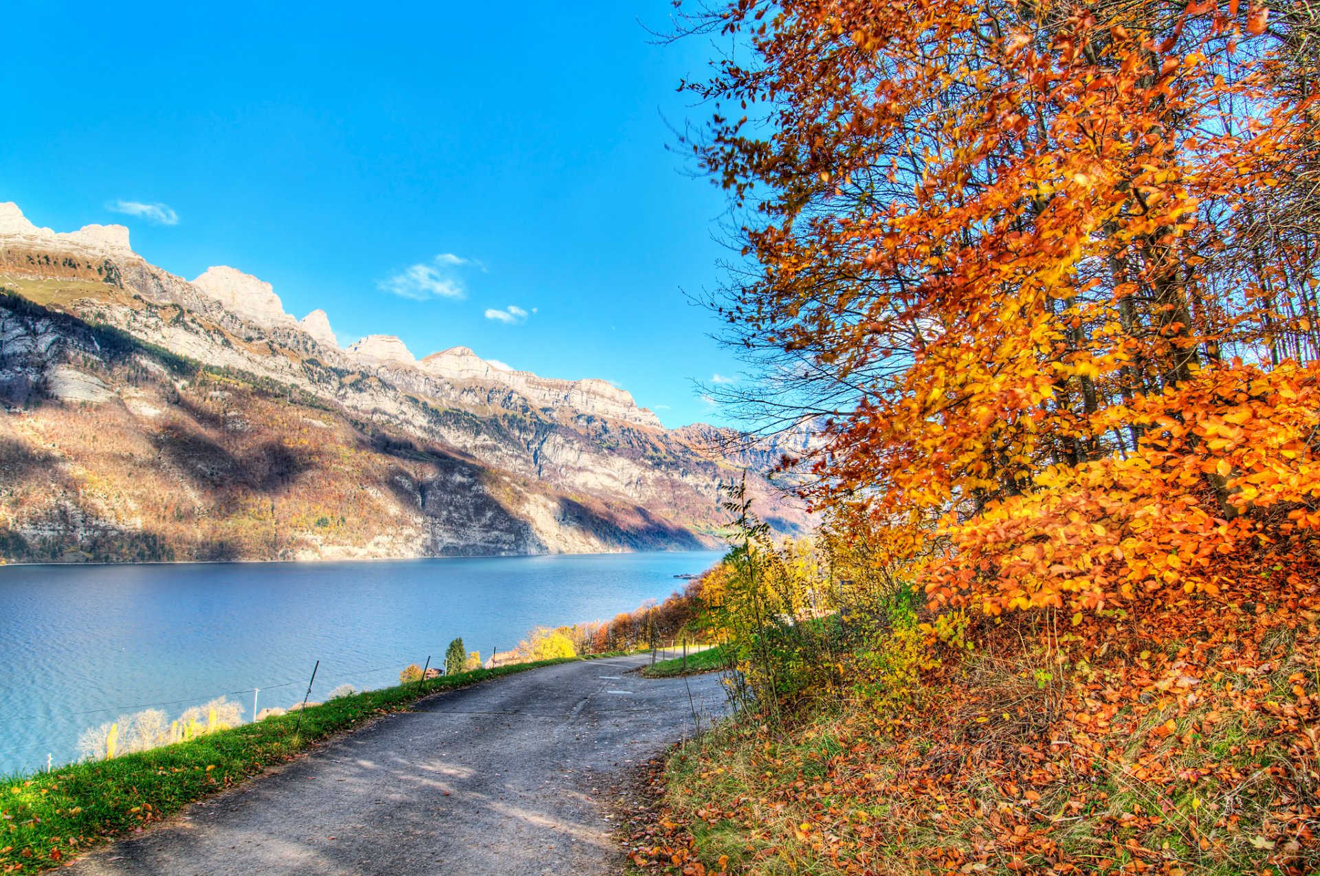 BMW inmitten der Herbstlandschaft und der gefallenen Blätter