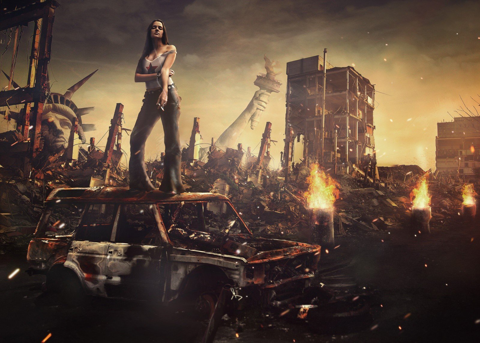 Postapokalypse einer selbstbewussten frau mit maschinePostapokalypse einer selbstbewussten Frau mit Maschine