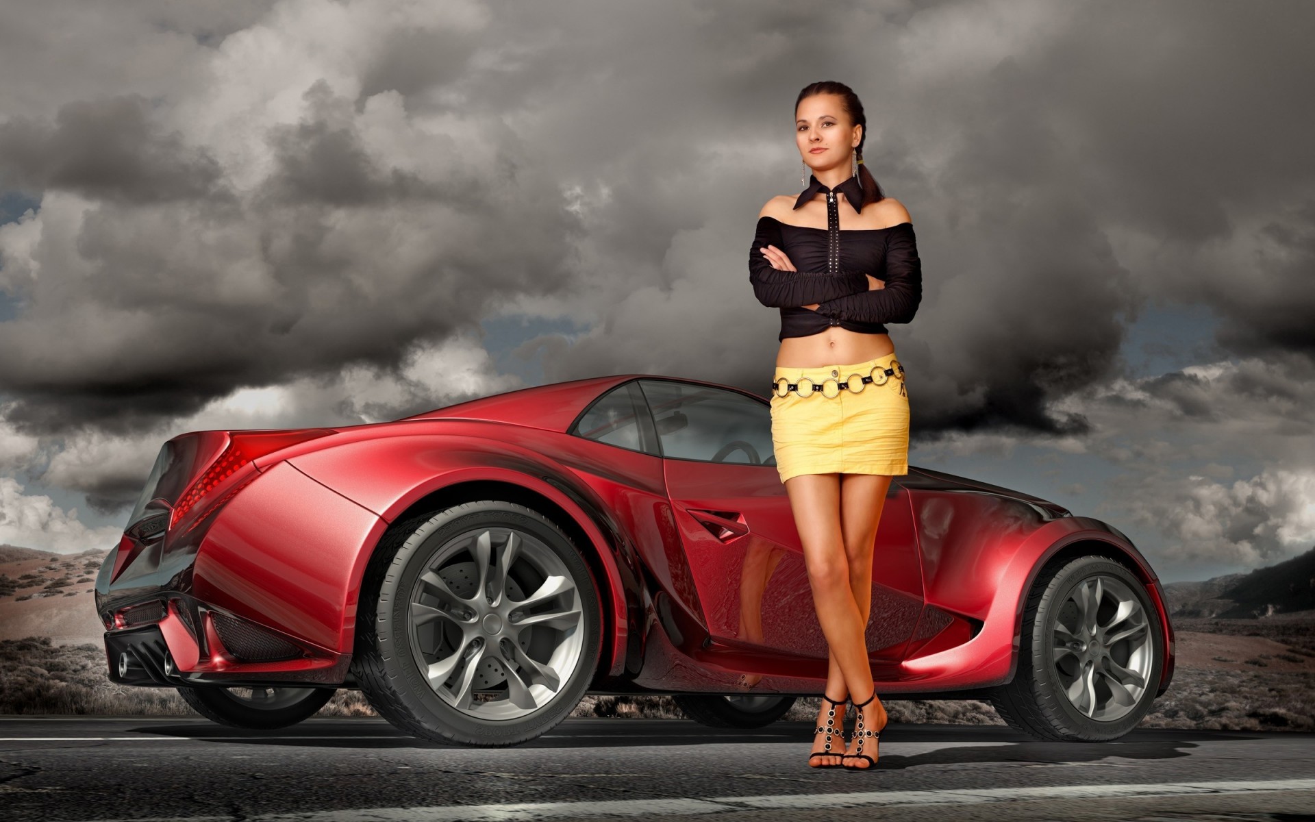 Mädchen im gelben Rock auf dem Hintergrund eines roten Sportwagens